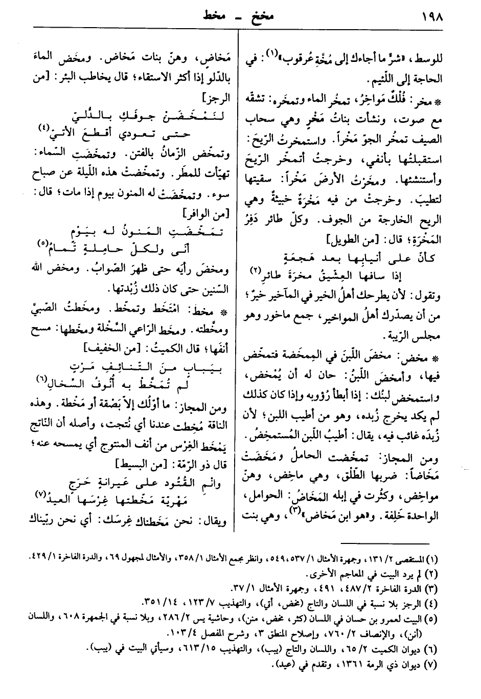 فلكٌ مواخر، تمخر الماء: تشقّه مع صوت، ونشأت بنات مخرٍ وهي سحاب الصيف تمخر الجو مخراً. واستمخرت الريح: استقبلتها بأنفي، وخرجت من فيه مخرة خبيثة وهي الريح الخارجة من الجوف. وكل طائر دفر المخرة. قال: