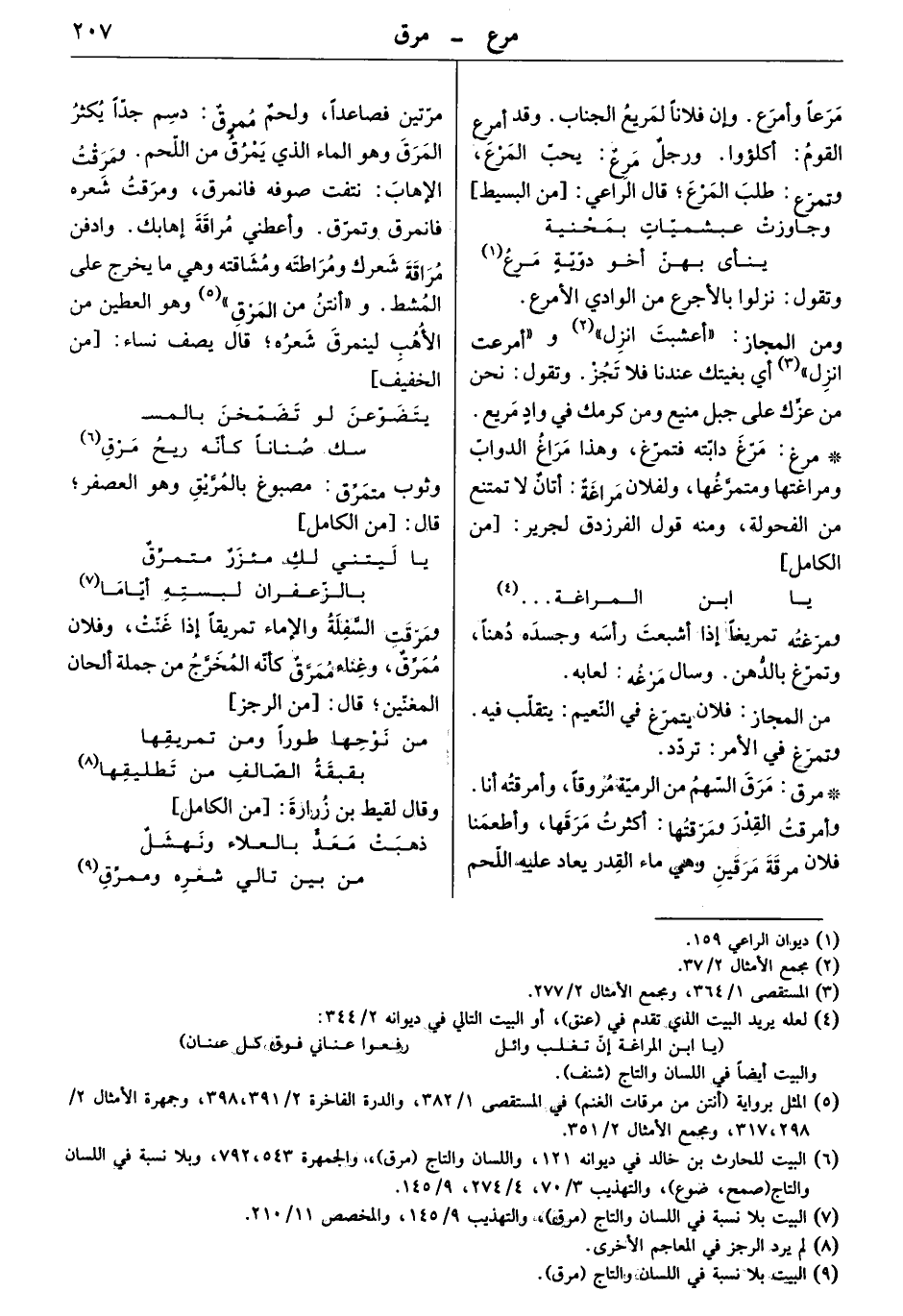 مرق السهم من الرمية مروقاً، وأمرقته أنا. وأمرقت القدر ومرّقتها: أكثرت مرقها، وأطعمنا فلان مرقة مرقين وهي ماء القدر يعاد عليه اللحم مرتين فصاعداً، ولحم ممرق: دسم جداً يكثر المرق وهو الماء الذي يمرق من اللحم. ومرقت الإهاب: نتفت صوفه فانمرق، ومرقت شعره فانمرق وتمرق. وأعطني مراقة إهابك. وادفن مراقة شعرك ومراطته ومشاقته وهي ما يخرج على المشط. و" أنتن من المرق " وهو العطين من الأهب لينمرق شعره. قال يصف نساء: