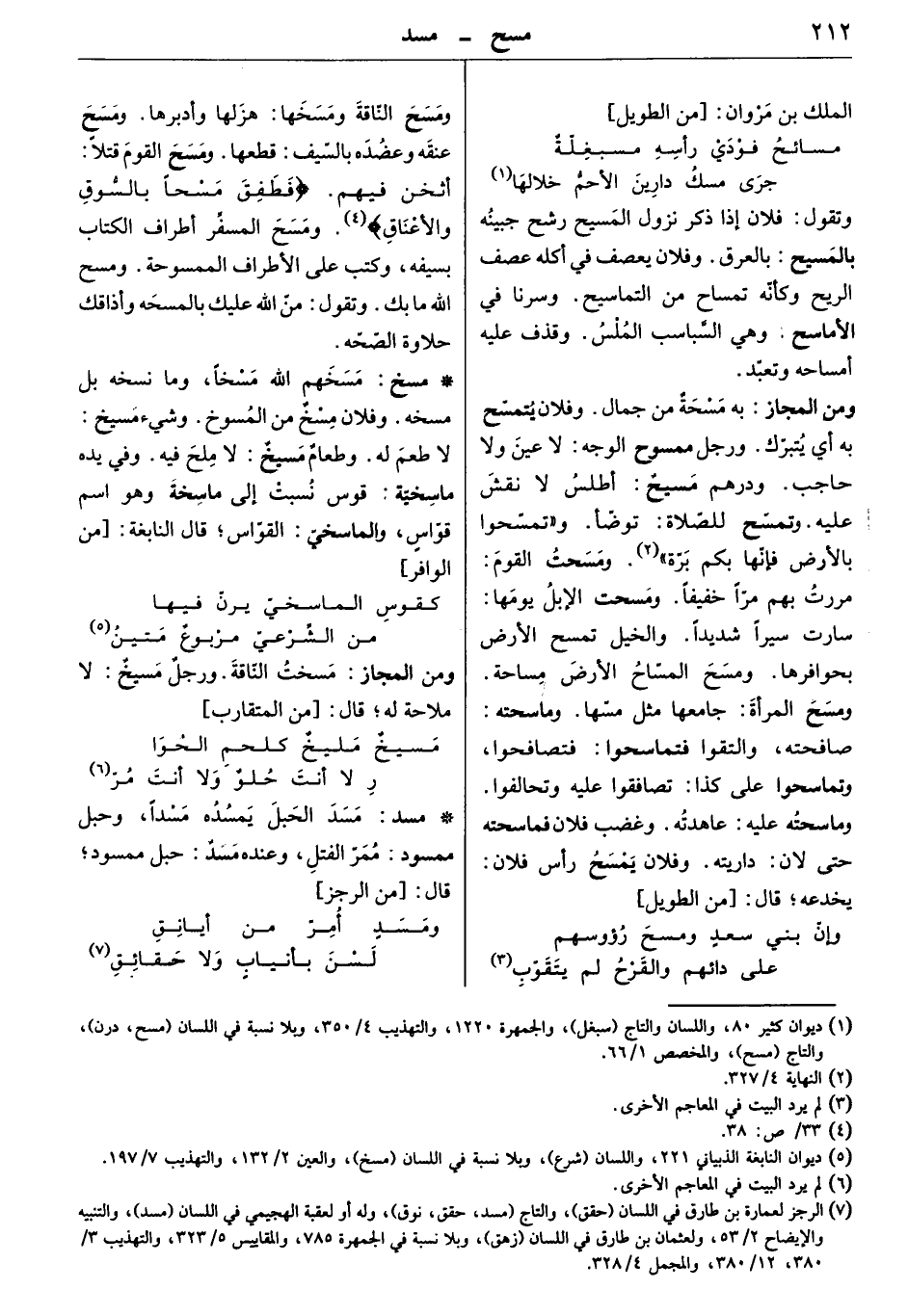 ومسح الناقة ومسخها: هزلها وأدبرها. ومسح عنقه وعضده بالسيف: قطعها. ومسح القوم قتلاً: أثخن فيهم. " فطفق مسحاً بالسوق والأعناق ". ومسح المسفّر أطراف الكتاب بسيفه، وكتب على الأطراف الممسوحة. ومسح الله ما بك. وتقول: منّ الله عليك بالمسحه: وأذاقك حلاوة الصّحّة.