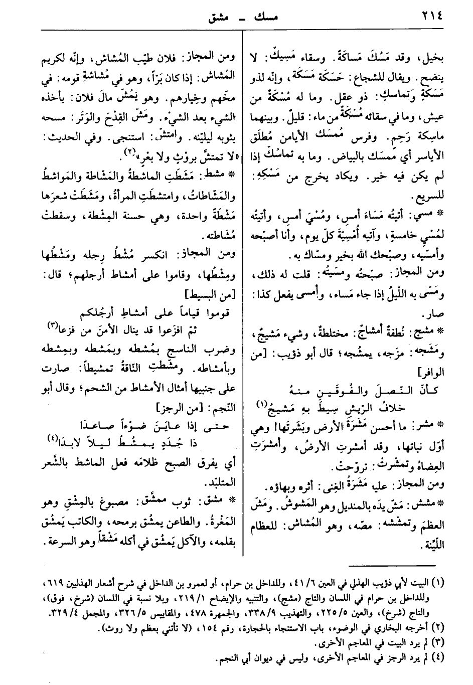 ومن المجاز: فلان طيّب المشاش، وإنه لكريم المشاش إذا كان برّاً، وهو في مشاشة قومه: في مخهم وخيارهم. وهو يمشّ مال فلان: يأخذه الشيء بعد الشيء. ومشّ القدح والوتر: مسحه بثوبه ليلينه. وامتشّ: استنجى. وفي الحديث: " لا تمتشّ بروث ولا بعر ".