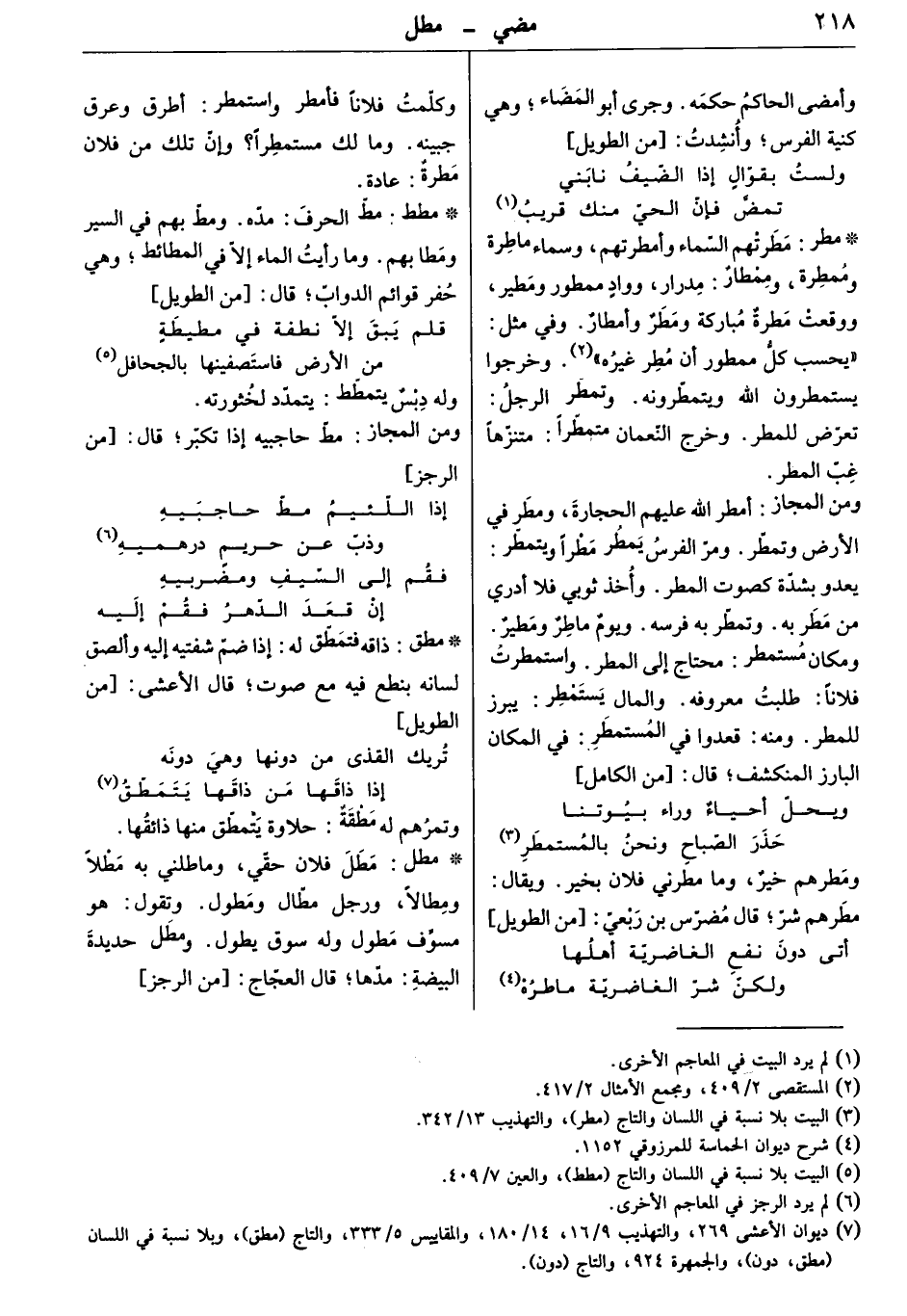 مطرتهم السماء وأمطرتهم، وسماء ماطرة وممطرة، وممطار: مدرار، ووادٍ ممطور ومطير، ووقعت مطرة مباركة ومطر وأمطار. وفي مثل " يحسب كل ممطور أن مطر غيره " وخرجوا يستمطرون الله ويتمطّرونه. وتمطّر الرجل: تعرّض للمطر. وخرج النّعمان متمطّراً: متنزهاً غبّ المطر.