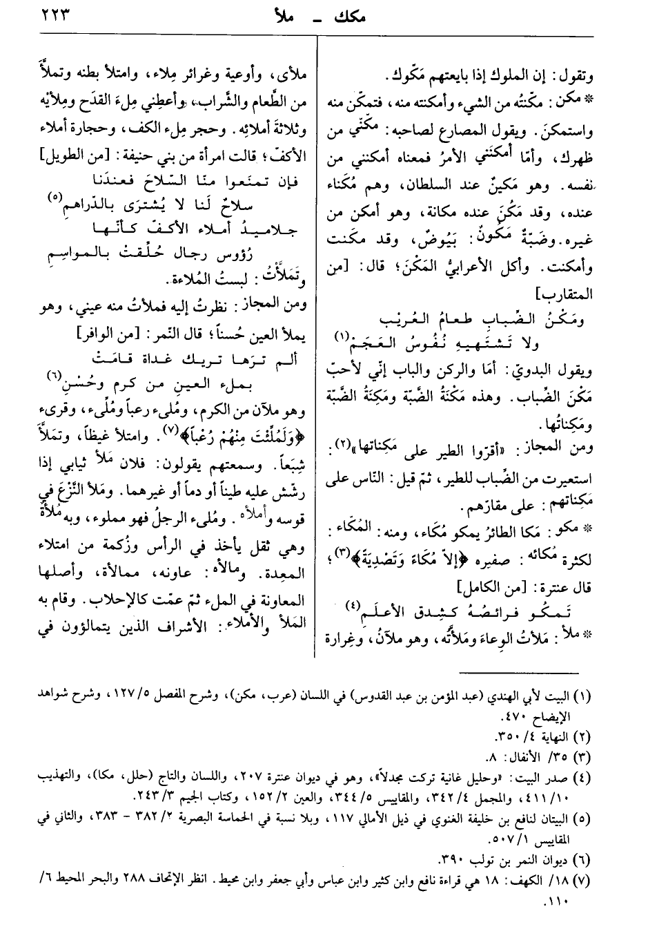 ملأت الوعاء وملأته، وهو ملان، وغرارة ملأى، وأوعية وغرائر ملاء، وامتلا بطنه وتملأ من الطعام والشراب، وأعطني ملء القدح وملأيه وثلاثة أملائه. وحجر ملء الكف، وحجارة أملاء الأكفّ. قالت امرأة من بني حنيفة: