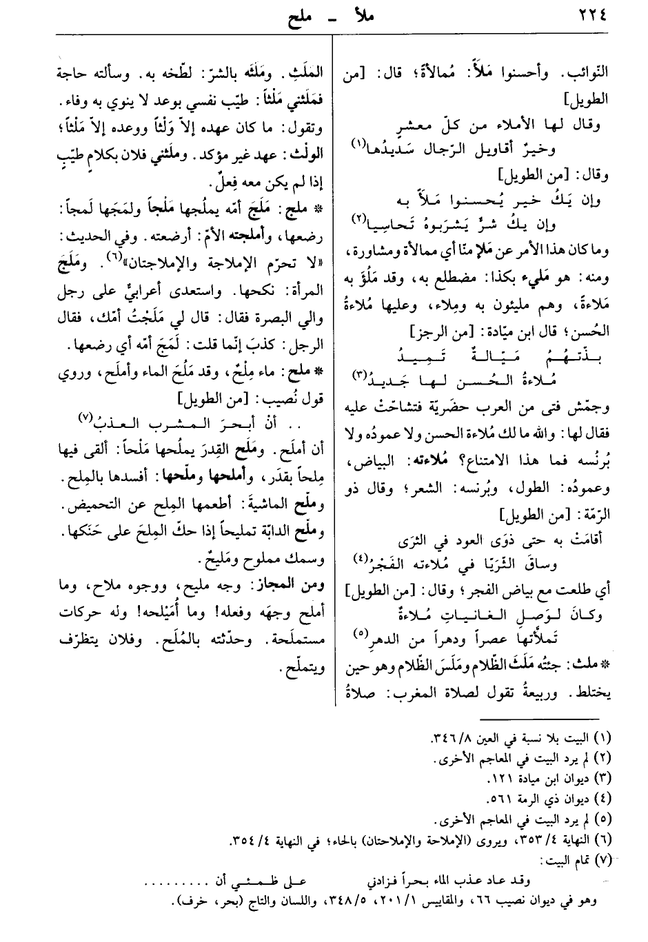 وما كان هذا الأمر عن ملإ منا أي ممالأة ومشاورة، ومنه: هو مليء بكذا: مضطلع به، وقد ملؤ به ملاءة وهم مليؤن به وملاء، وعليها ملاءة الحسن. قال ابن ميّادة: