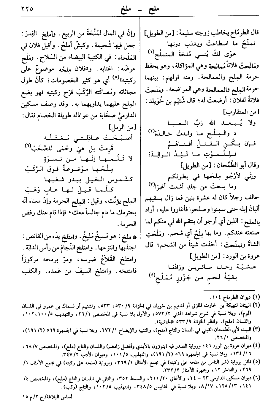 وإن في المال لملحةً من الربيع. وأملح القدر: جعل فيها شحيمة. وكبش أملح. وأقبل فلان في الملحاء: في الكتيبة البيضاء من السلاح. وملح عرضه: اغتابه. " وفلان ملحه موضعوع على ركبتيه " أي هو كثير الخصومات كأنّ طول مجاثاته ومصاكّته الرّكب فرّرح ركبتيه فهو يضع الملح عليهما يداويهما به. وقد وصف مسكين الدارميّ صخّابة من عواذله طويلة الخصام فقال: