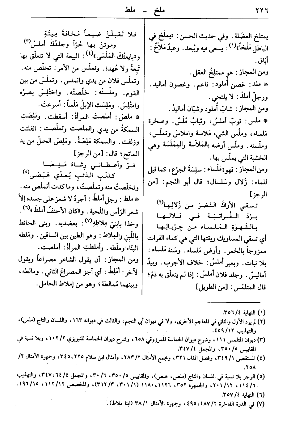 أي تسقي المساويك ريقتها التي هي كماء الفرات ممزوجاً بالخمر. وأرض ملساء. وسنة ملساء: بلا نبات. وبعير أملس: خلاف الأجرب: وبيد أماليس. وجلد فلان أملس إذا لم يتعلق به ذمّ. قال المتلمّس: