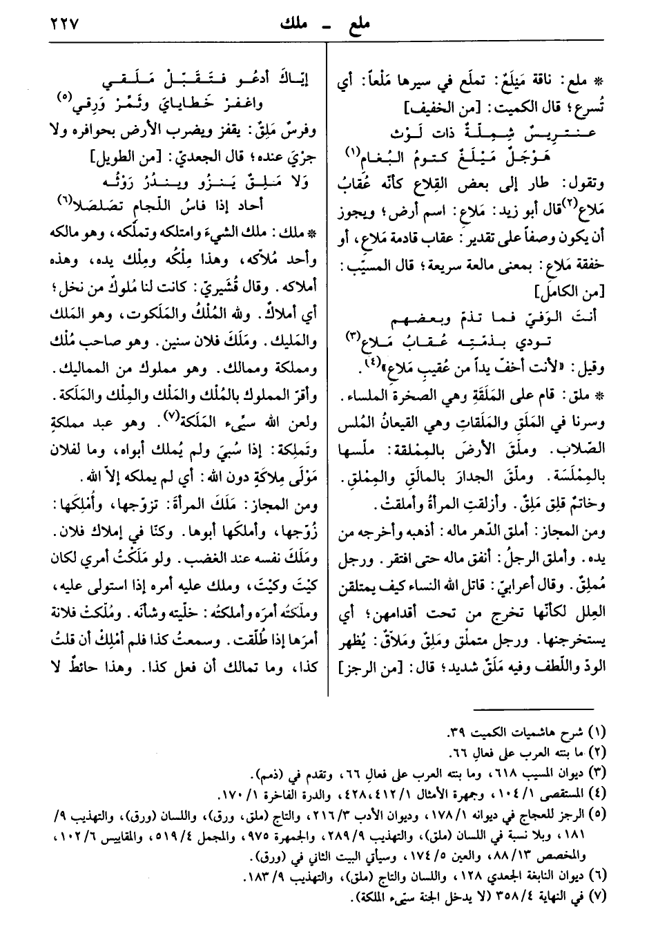 الشيء وامتلكه وتملّكه، وهو مالكه وأحد ملاّكه، وهذا ملكه وملك يده، وهذه أملاكه. وقال قشيريّ: كانت لنا ملوك من نخل أي أملاك. ولله الملك والملكوت، وهو الملك والمليك. وملك فلان سنين. وهو صاحب ملك ومملكة وممالك. وهو مملوك من المماليك. وأقرّ المملوك بالملك والملكة. ولعن الله سيء الملكة. وهو عبد مملكة وتملكة إذا سبي ولم يملك أبواه، وما لفلان مولى ملاكة دون الله أي لم يملكه إلا الله.