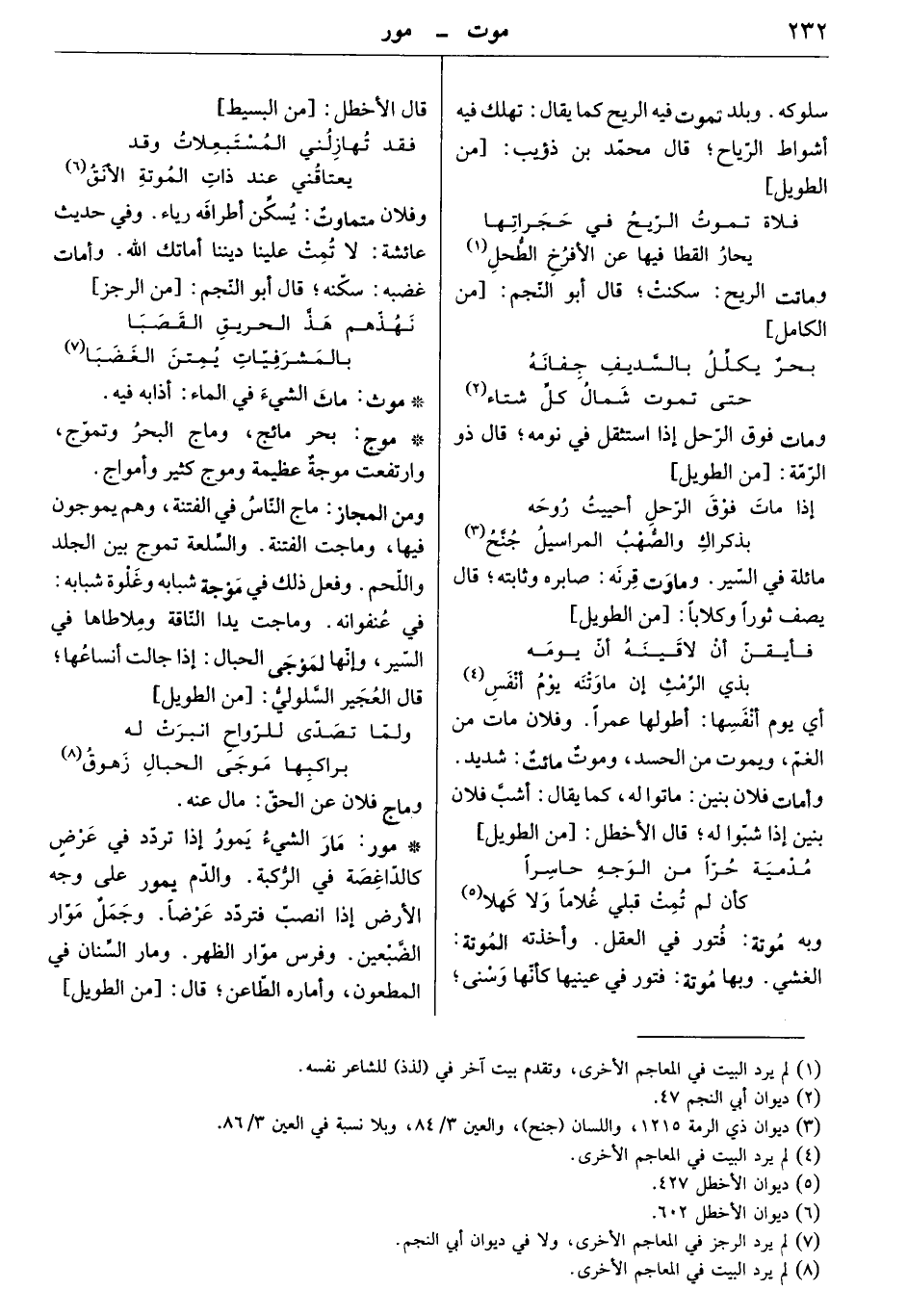 مات موتةً لم يمتها أحد، ومات ميتة سوء، وأماته الله، وهو ميّت وميت، وهم موتى وأموات وميتون. وموّتت البهائم. وأكل الميتة. وفلان مستميت: مسترسل للموت كمستقتل. قال: