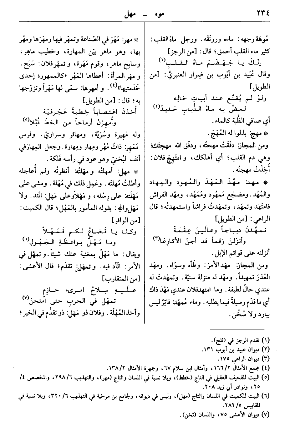 عندي مويه ومويهة ومياه وأمواه، وماهت الرّكيّة: كثر ماؤها، وحفروا حتى أماهوا: بلغوا الماء، وأماهوا ركيّتهم: أنبطوا ماءها، وأماه دوابّه: سقاها، وأمهني: اسقني، وأميهوا حوضكم: اجمعوا فيه الماء، وركيّة ماهةٌ وميّهةٌ. وبلد ماهٌ وميّه. وسمعت بالبادية كوفيّاً يقول لأعرابيّ: كيف ماوان؟ قال: ميّهة، قال أميه مما كانت؟ قال: نعم أموه مما كانت. وأماهت الأرض: ظهر بزّها. وموّهوا قدوركم. وقال ذو الرمّة: