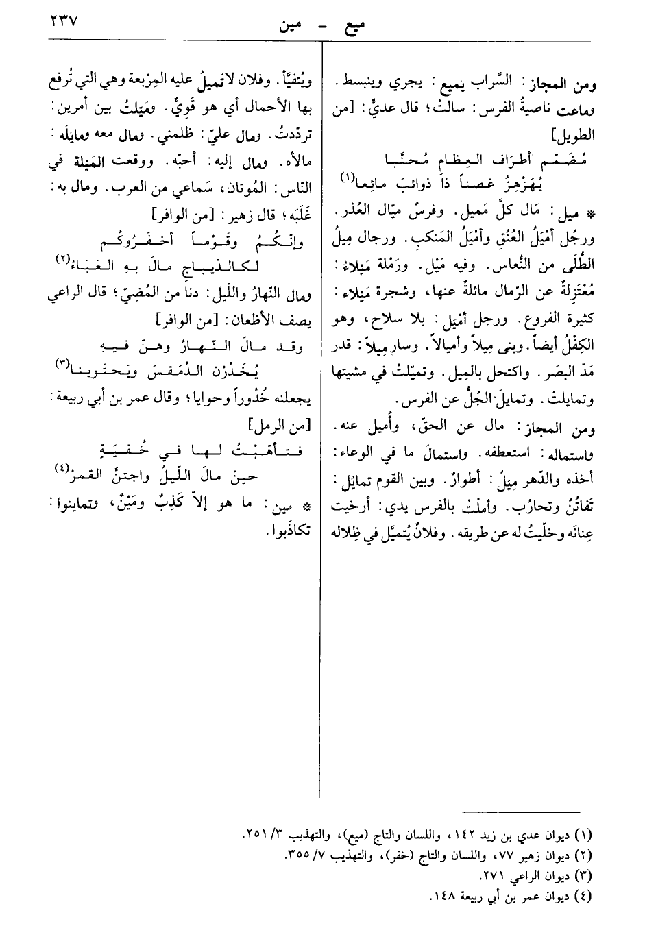 ومن المجاز: مال عن الحقّن وأميل عنه. واستماله: استعطفه. واستمال ما في الوعاء: أخذه. والدهر ميلٌ: أطوار. وبين القوم تمايل: تفاتن وتحارب. وأملت بالفرس يدي: أرخيت عنانه وخلّيت له عن طريقه. وفلان يتميّل في ظلاله ويتفيّأ. وفلان لا تميل عليه المربعة وهي التي ترفع بها الأحمال أي هو قويّ. وميلت بين أمرين: ترددت. ومال عليّ: ظلمني ومال معه ومايله: مالأه. ومال إليه: أحبه. ووقعت الميلة في الناس: الموتان سماعي من العرب. ومال به: غلبه. قال زهير: