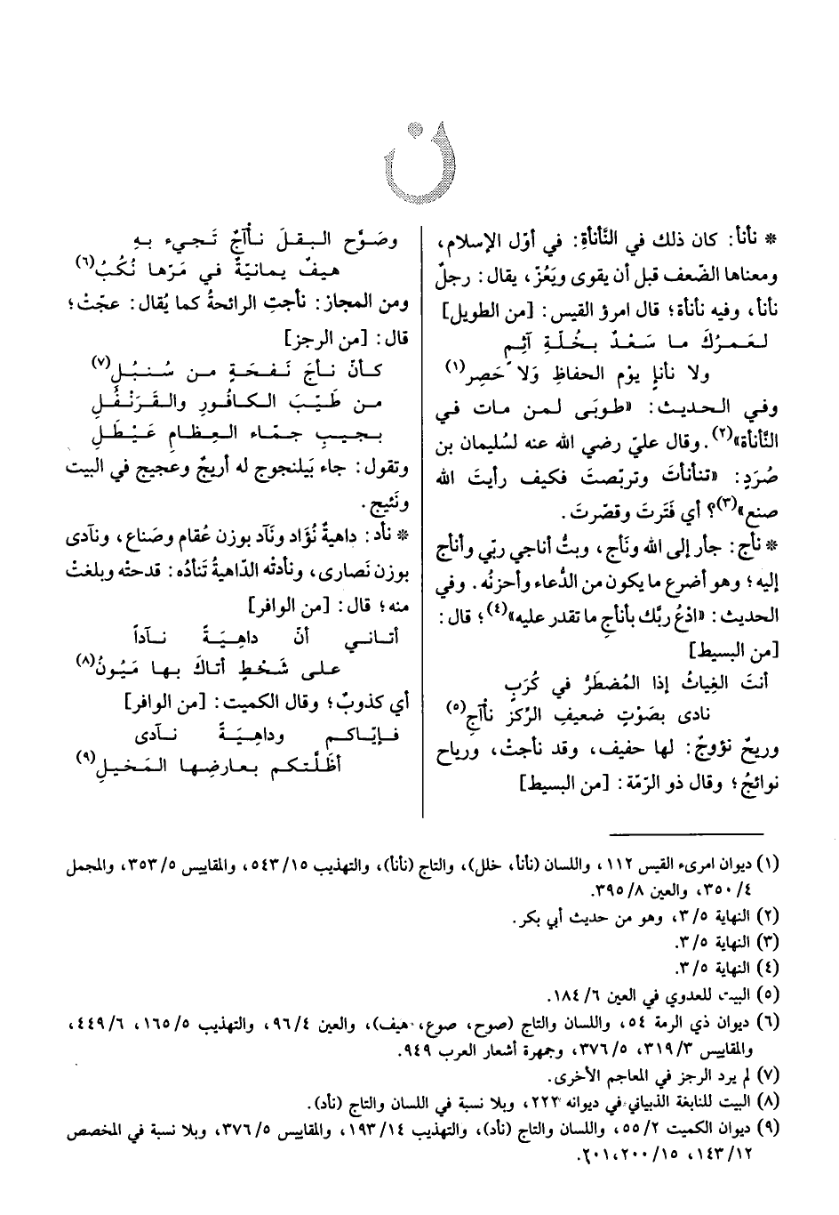 وفي الحديث: " طوبى لمن مات في النأنأة " وقال علي رضي الله عنه لسليمان بن صردٍ: تنأنأت وتربصت فكيف رأيت الله صنع أي فترت وقصرت.