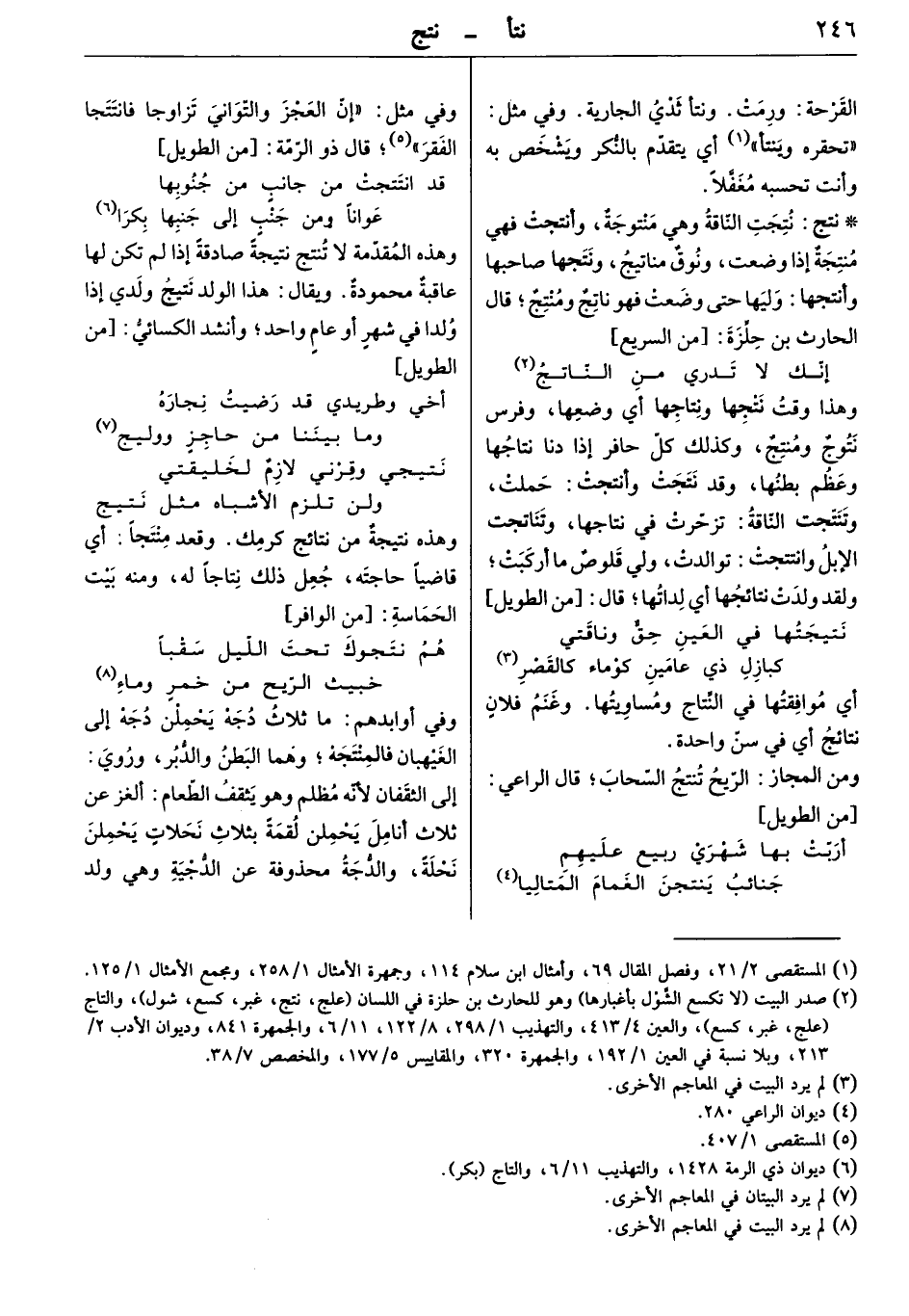 نتجت الناقة وهي منتوجةٌ، وأنتجت فهي منتجةٌ إذا وضعت، ونوقٌ مناتيج، ونتجها صاحبها وأنتجها: وليها حتى وضعت فهو ناتج ومنتج. قال الحارث بن حلّزة: