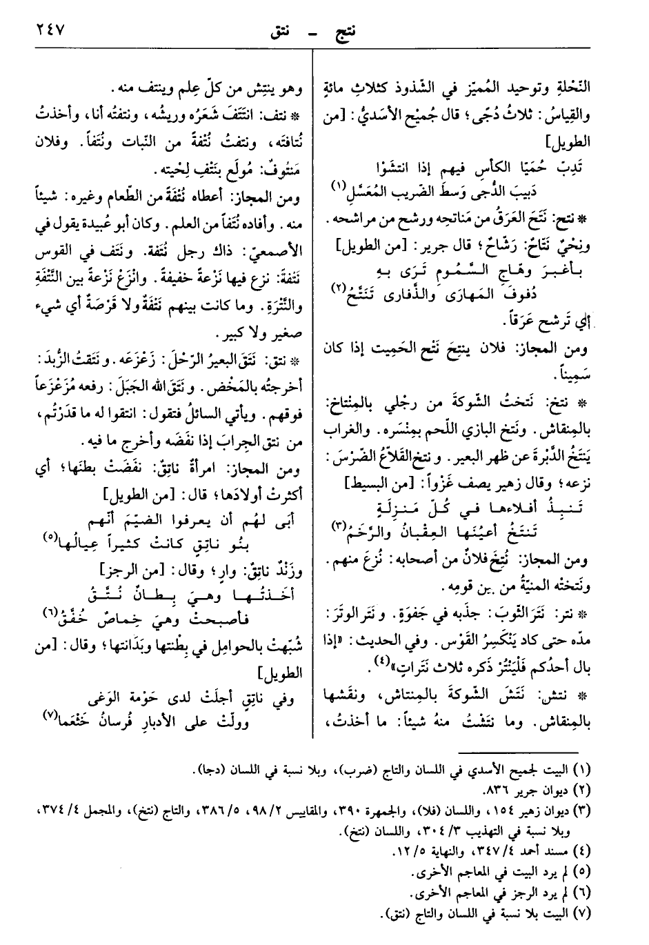 نتش الشوكة بالمنتاش، ونقشها بالمنقاش. وما نتشت منه شيئاً: ما أخذت، وهو ينتش من كل علم وينتف منه.