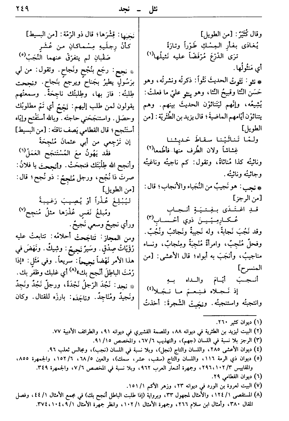 رجع بنجحٍ ونجاحٍ. وتقول: من لي برسول يطير بجناح، ويرجع بنجاح. ونجحت طلبته: فاز بها، وطلبتك ناجحة. وسمعتهم يقولون لمن طلب إليهم: نجح أي تمّ مطلوبك وحصل. واستنجحني حاجته. وبالله أستفتح، وإياه أستنجح. قال القطامي يصف ناقته: