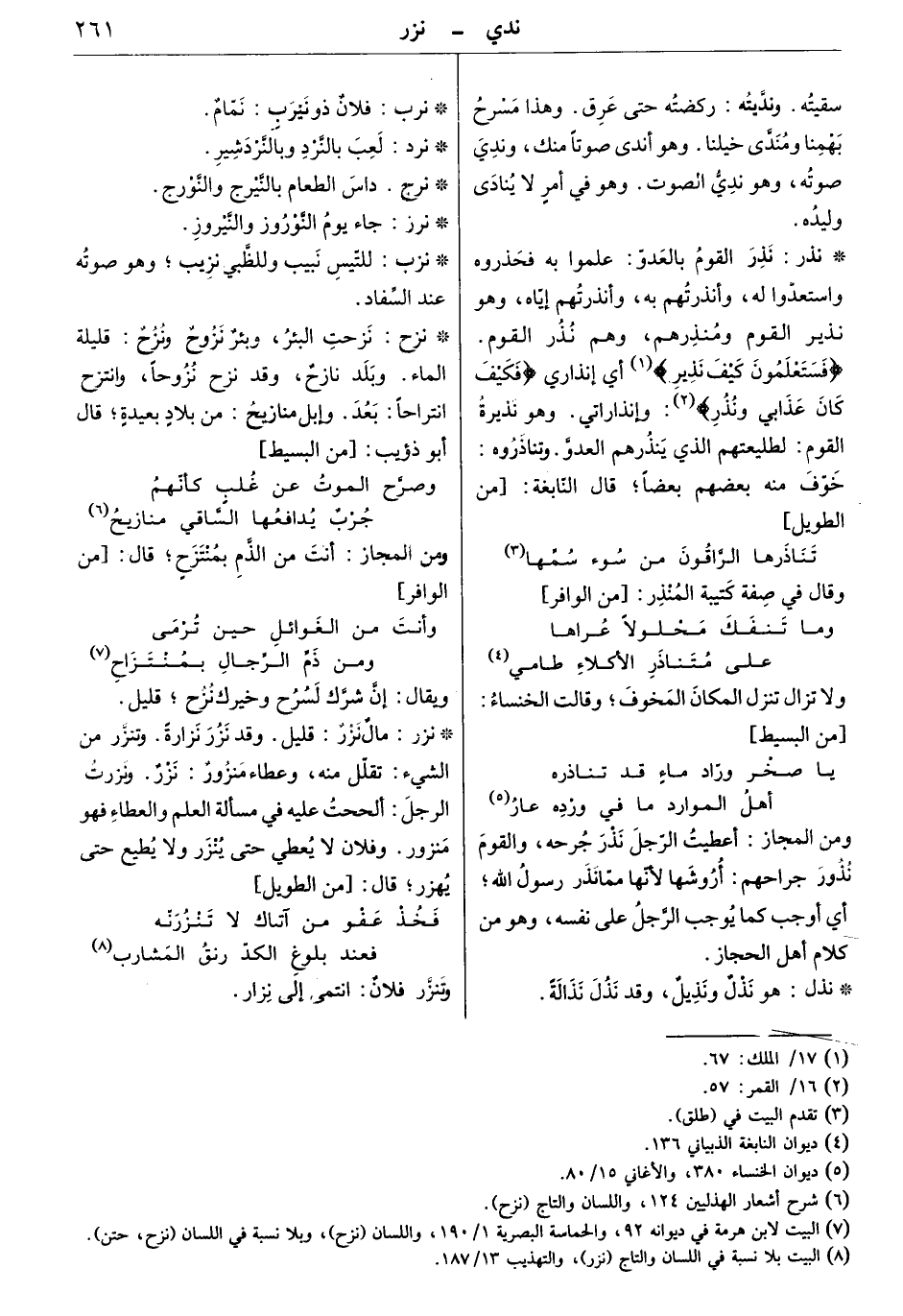 نذر القوم بالعدوّ: علموا به فحذروه واستعدّوا له وأنذرتهم به، وأنذرتهم إيّاه، وهو نذير القوم ومنذرهم، وهم نذر القوم. " فستعلمون كيف نذير " أي إنذاري " فكيف كان عذابي ونذر ": وإنذاراتي. وهو نذيرة القوم: لطليعتهم الذي ينذرهم العدوّ. وتناذروه: خوف منه بعضهم بعضاً. قال النابغة: