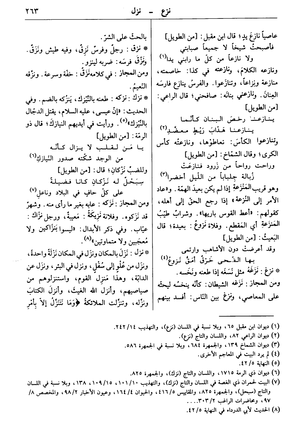 وهو قريب المنزعة إذا لم يكن بعيد الهمّة. " وعاد الأمر إلى النّزعة " إذا رجع الحق إلى أهله، كقولهم: " أعط القوس باريها ". وشراب طيب المنزعة أي المقطع. وفلاة نزوع: بعيدة. قال البعيث: