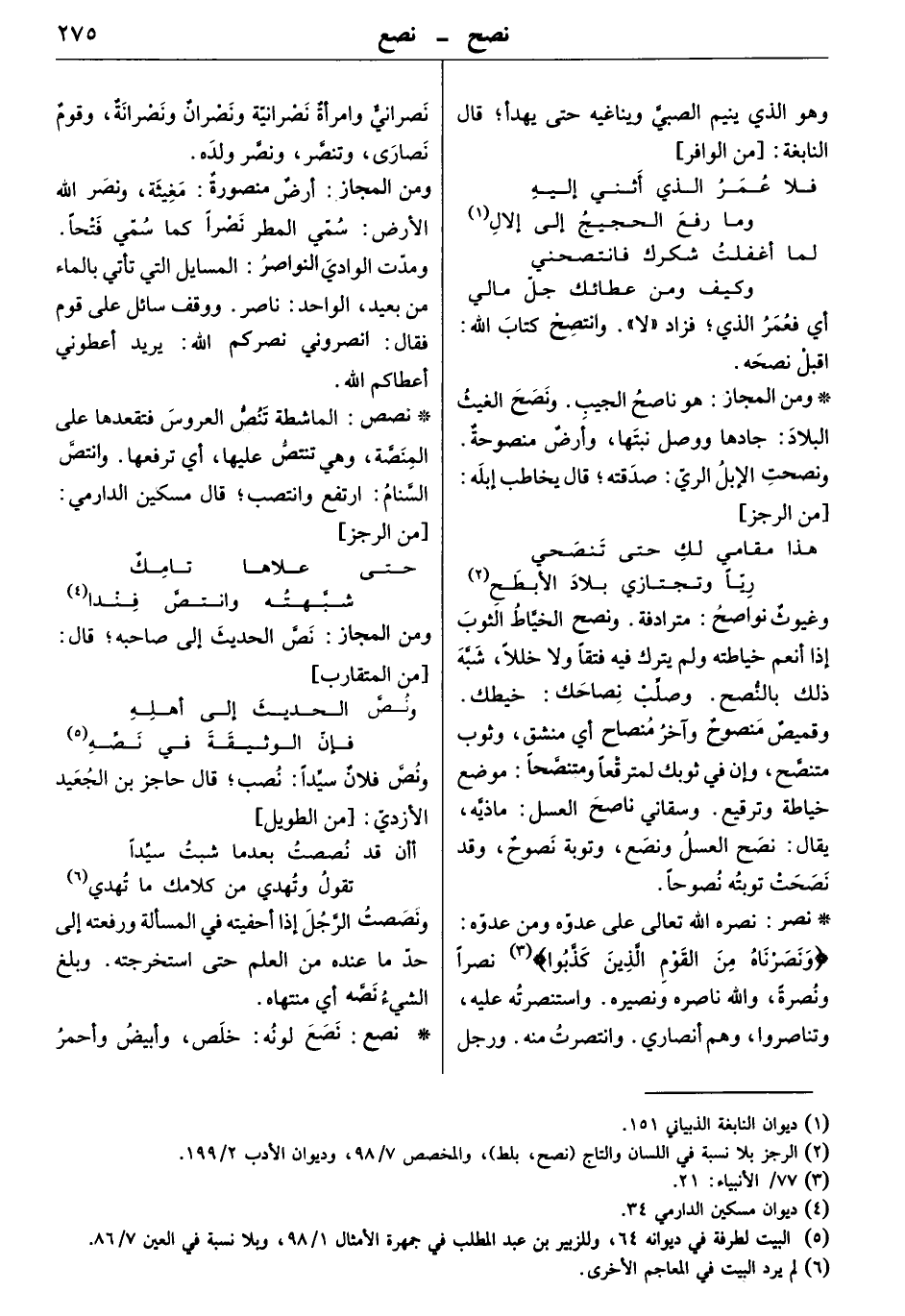 نصره الله تعالى على عدوّه ومن عدوّه: " ونصرناه من القوم الذين كذّبوا " نصراً ونصرة، والله ناصره ونصيره. واستنصرته عليه، وتناصروا، وهم أنصاري. وانتصرت منه. ورجل نصراني وامرأة نصرانيّة ونصران ونصرانة، وقوم نصارى، وتنصّر، ونصّر ولده. ومن المجاز: أرض منصورة: مغيثة، ونصر الله الأرض: سمّى المطر نصراً كما سمّى فتحاً. ومدّت الوادي النواصر: المسابل التي تأتي بالماء من بعيد، الواحد: ناصر. ووقف سائل على قوم فقال: انصروني نصركم الله: يريد أعطوني أعطاكم الله.
