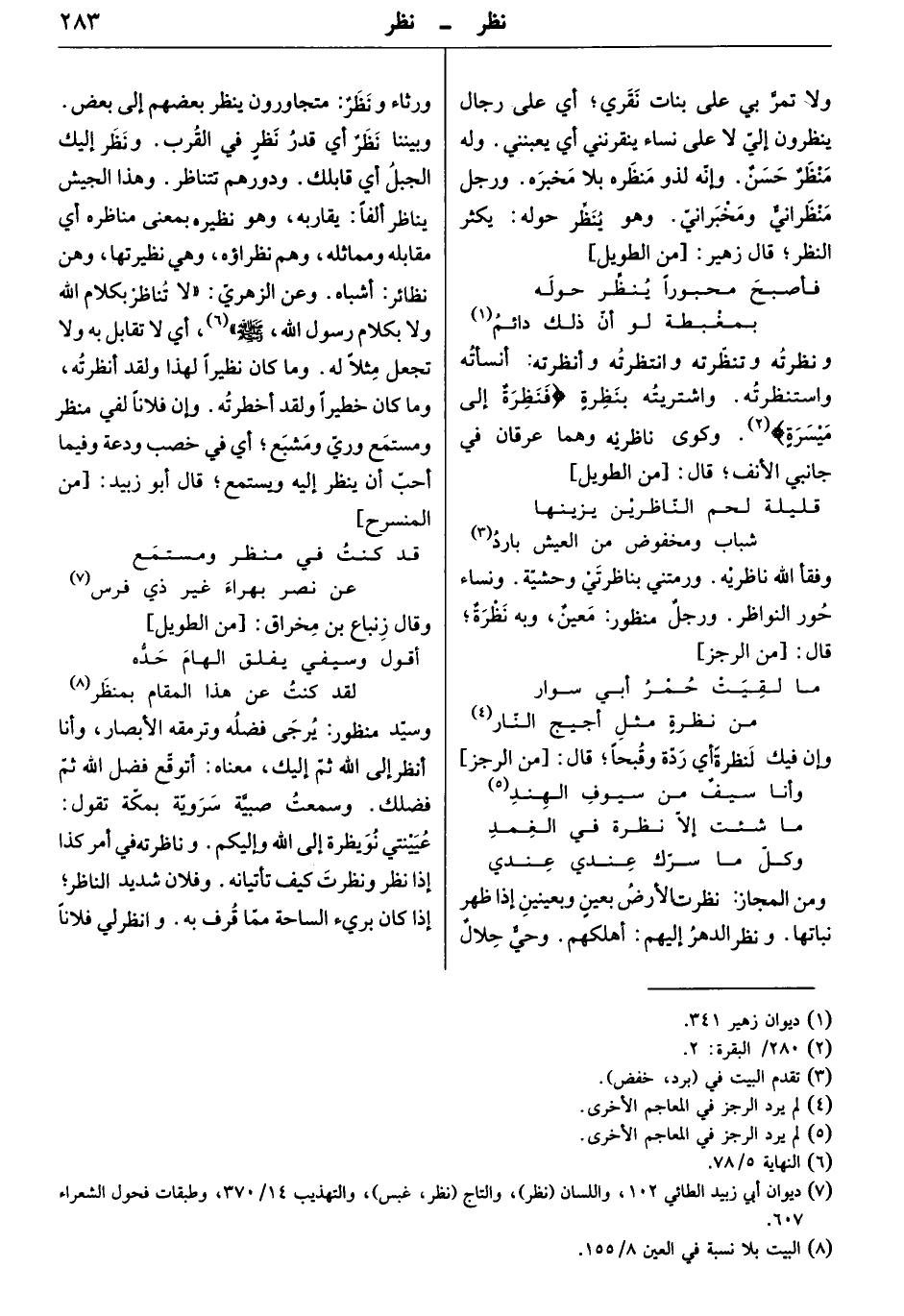 ونظرته وتنظّرته وانتظرته وأنظرته: أنسأته واستنظرته. واشتريته بنظرة " فنظرة إلى ميسرة " وكوى ناظريه وهما عرفان في جانبي الأنف. قال: