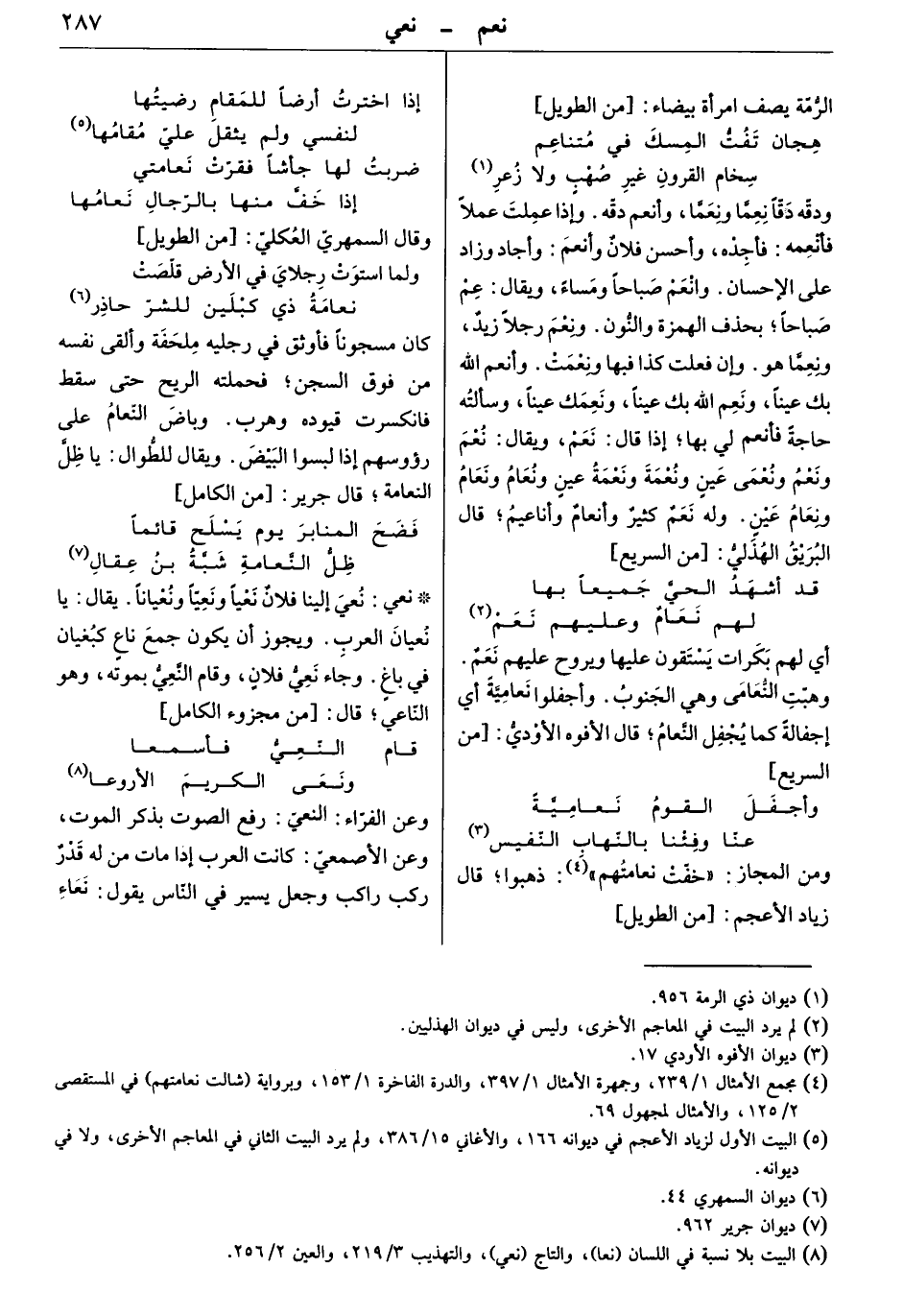 ودقة دقاً نعماً، وأنعم دقّه. وإذا عملت عملاً فأنعمه: فأجده. وأحسن فلان وأنعم: وأجاد وزاد على الإحسان. وانعم صباحاً ومساءً ويقال: عم صباحاً بحذف النون. ونعم رجلاً زيد، ونعيماً هو. وإن فعلت كذا فيها ونعمت وأنعم الله بك عيناً، ونعم الله بك عيناً، ونعمك عيناً. وسألته حاجة فأنعم لي بها إذا قال: نعم، ويقال: نعم ونعمى عين ونعمة عين ونعام عين. وله نعم كثير وأنعام وأناعيم. قال البريق الهذليّ: