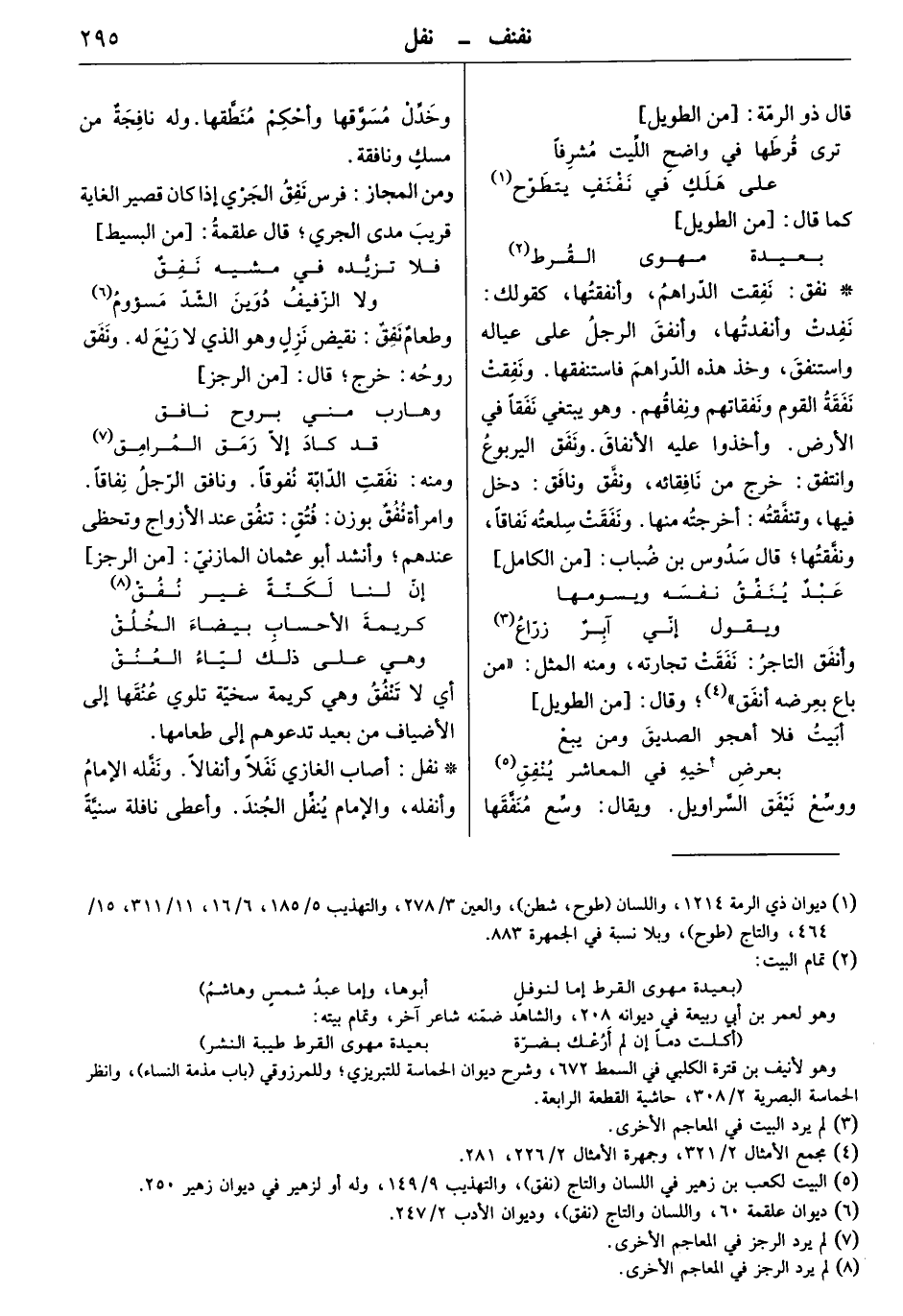 ومنه: نفقت الدابّة نفوقاً. ونافق الرجل نفاقاً. وامرأة نفق بوزن: فنق: تنفق عند الأزواج وتحظى عندهم. وأنشد أبو عثمان المازنيّ: