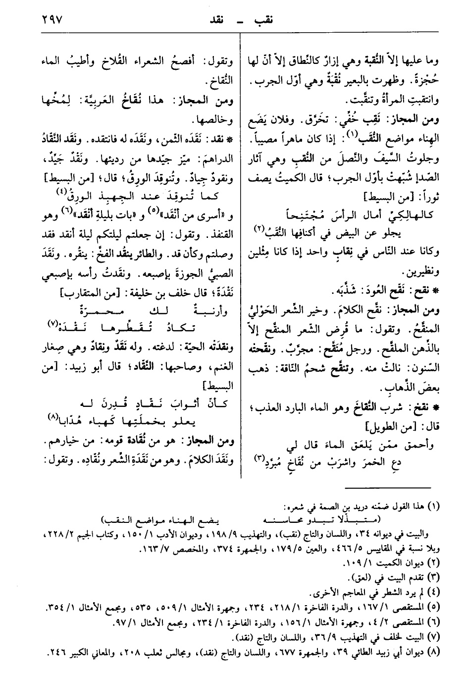 ومن المجاز: هو من نقّادة قومه: من خيارهم. ونقد الكلام. وهو من نقدة الشعر ونقّاده. وتقول: