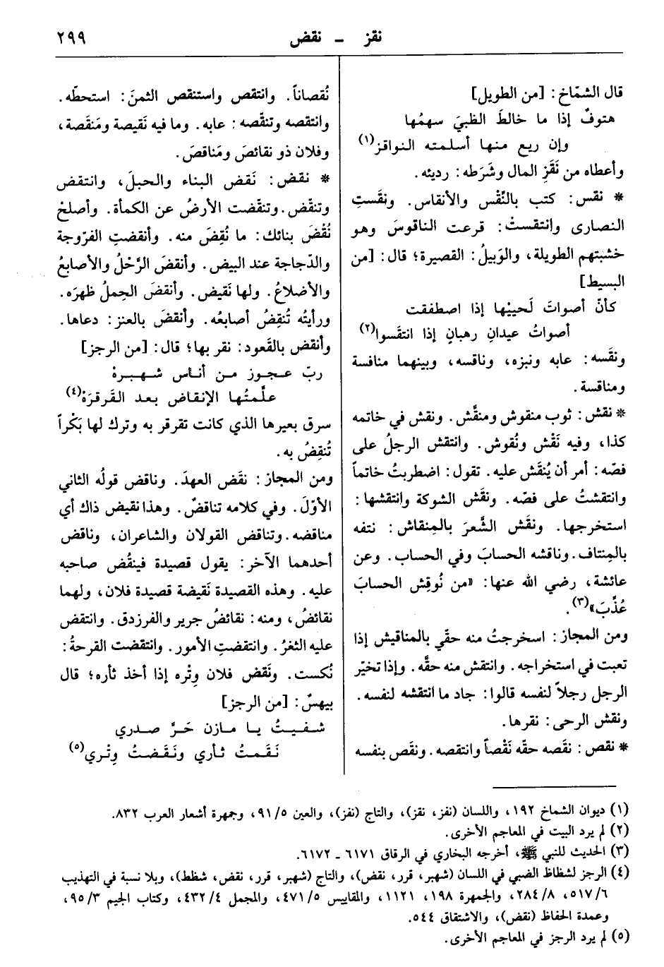 نقض البناء والحبل، وانتقض وتنقّض. وتنقّضت الأرض عن الكمأة. وأصلح نقض بنائك: ما نقض منه. وأنقضت الفرّوجة والدّجاجة عند البيض. وأنقض الرّحل والأصابع والأضلاع. ولها نقيض. وأنقض الحمل ظهره. ورأيته نتقض أصابعه. وأنقض بالعنز: دعاها. وأنقض بالقعود: نقربها. قال: