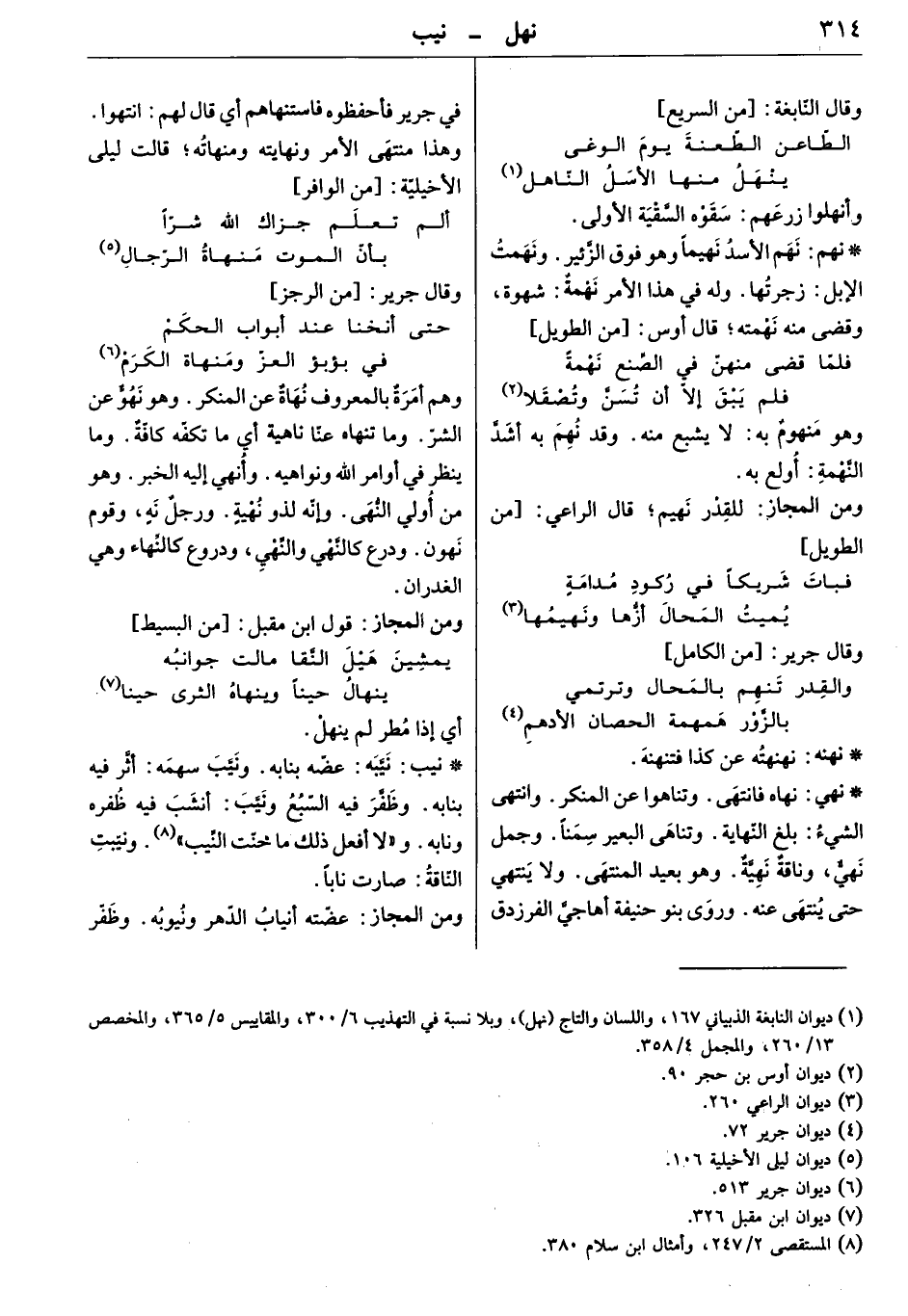 نهاه فانتهى. وتناهوا عن المنكر. وانتهى الشيء: بلغ النهاية. وتناهى البعير سمناً وجمل نهيٌّ، وناقة نهيّة. وهو بعيد المنتهى. ولا ينتهي حتى ينتهى عنه. وروَى بنو حنيفة أهاجيّ الفرزدق في جرير فأحفظوه فاستنهاهم أي قال لهم: انتهوا. وهذا منتهى الأمر ونهايته ومنهاته. قالت ليلى الأخيلية: