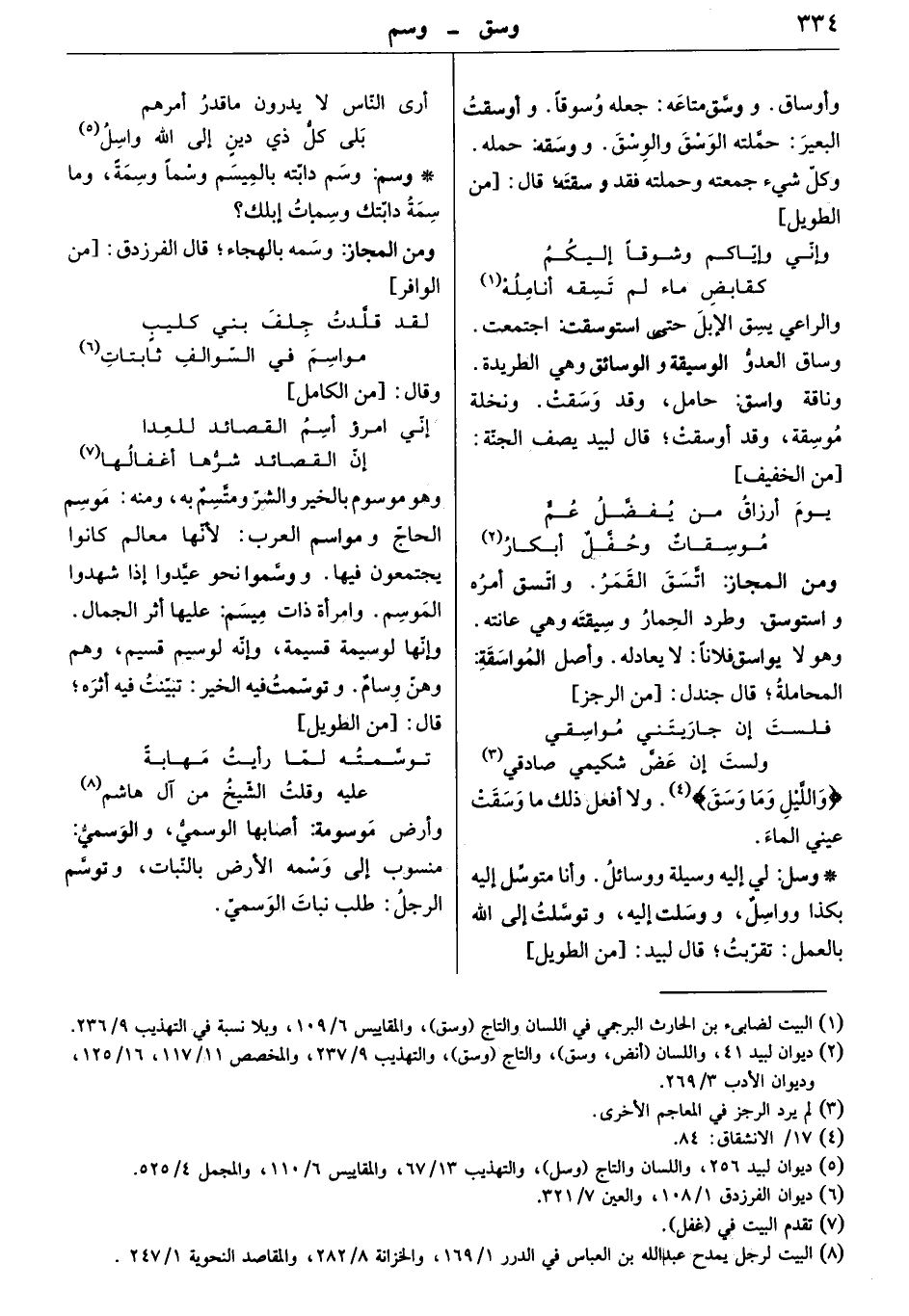 وأوساق. ووسّق متاعه: جعله وسوقاً. وأوسقت البعير: حمّلته الوسق. ووسقه. حمله. وكلّ شيء جمعته وحملته فقد وسقته. قال: