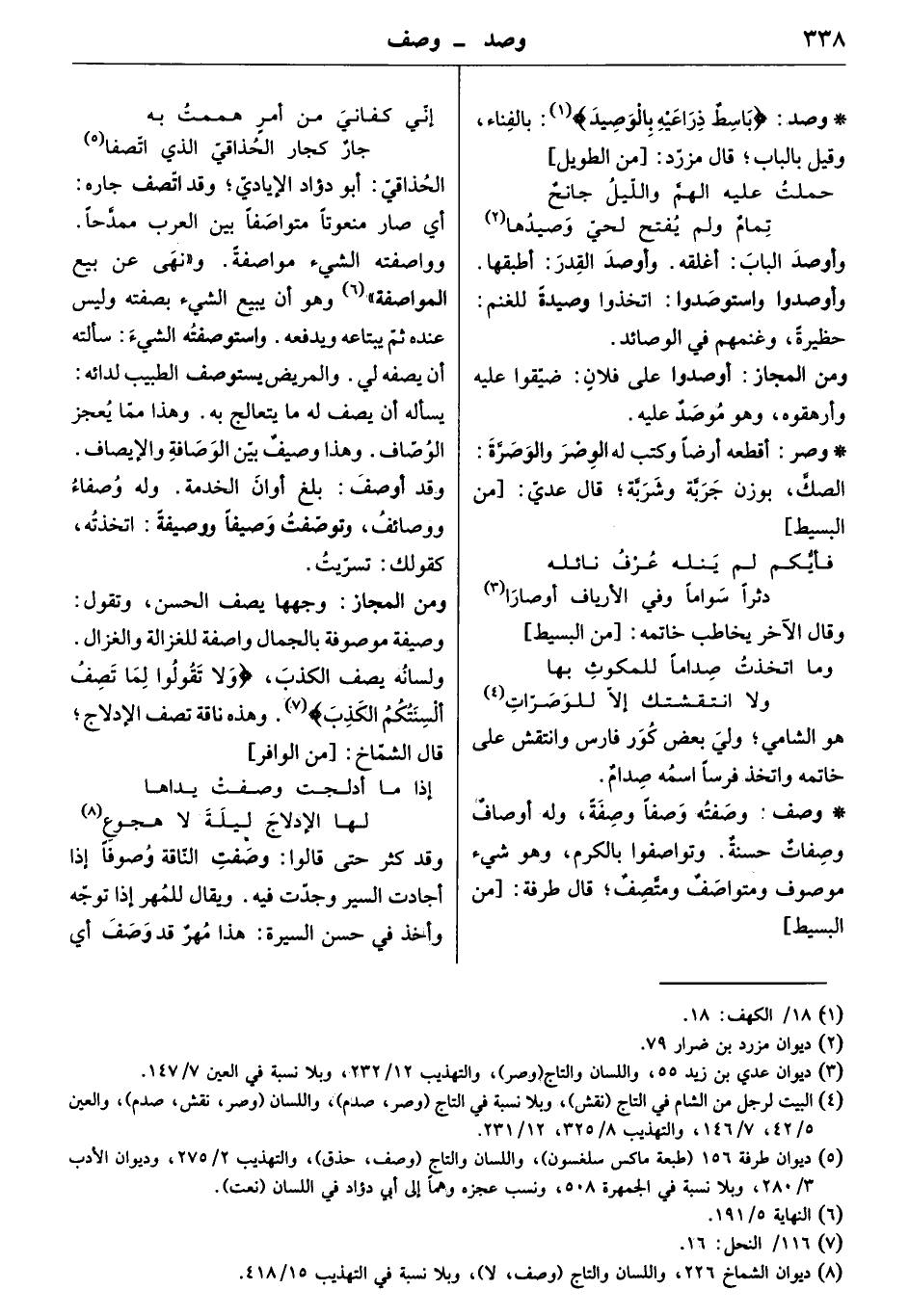 الحذاقيّ: أبو دؤاد الإياديّ وقد اتصف جاره أي صار منعوتاً متواصفاً بين العرب ممدّحاً. وواصفته الشيء مواصفةً. " ونهي عن بيع المواصفة " وهو أن يبيع الشيء بصفته وليس عنده ثم يبتاعه ويدفعه. واستوصفته الشيء: سألته أن يصفه لي. والمريض يستوصف الطبيب لدائه: يسأله أيصف له ما يتعالج به. وهذا مما يعجز الوصاف. وهذا وصيف بيّن الوصافة والإيصاف. وقد أوصف: بلغ أوان الخدمة. وله وصفاء ووصائف، وتوصّفت وصيفاً ووصيفةً: اتخذته، كقولك: تسرّيت.