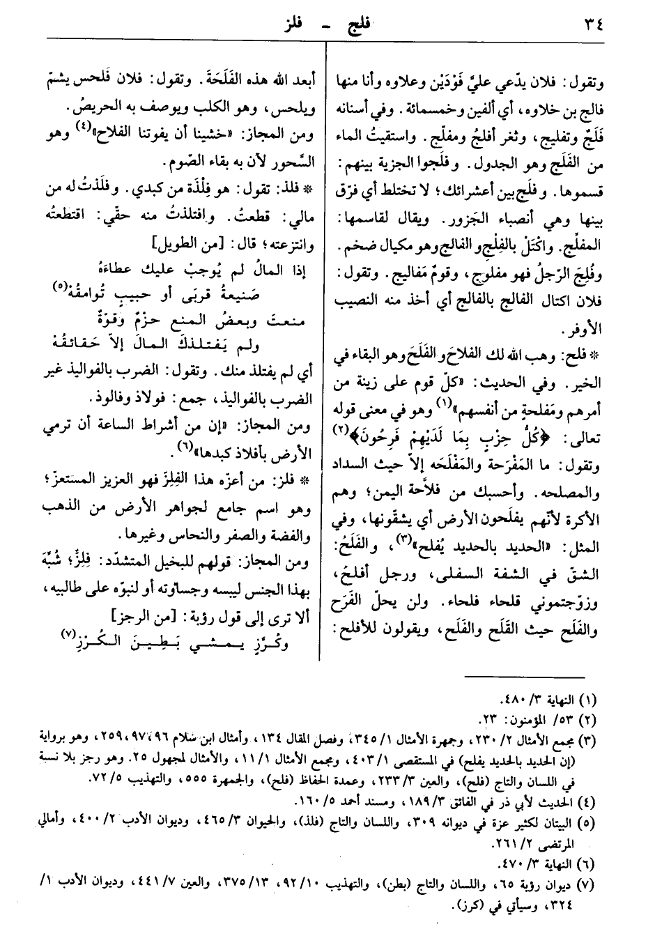 وهب الله لك الفلاح والفلح وهو البقاء في الخير. وفي الحديث " كلّ قوم على زينة من أمرهم ومفلحة من أنفسهم " وهو في معنى قوله تعالى " كل حزب بما لديهم فرحون " وتقول ما للفرحة والمفلحة، إلا حيث السداد والمصلحة. وأحسبك من فلاّحة اليمن وهم الأكرة لأنهم يفلحون الأرض أي يسقونها. وفي المثل " الحديد بالحديد يفلح " والفلح: الشق في الشفة السفلى، ورجل أفلح. وزوجتموني قلحاء فلحاء. ولن يحلّ الفرح والفلح، حيث القلح والفلح، ويقولون للأفلح: أبعد الله هذه الفلحة. وتقول: فلان فلحس، يشمّ ويلحس، وهو الكلب ويوصف به الحريص.