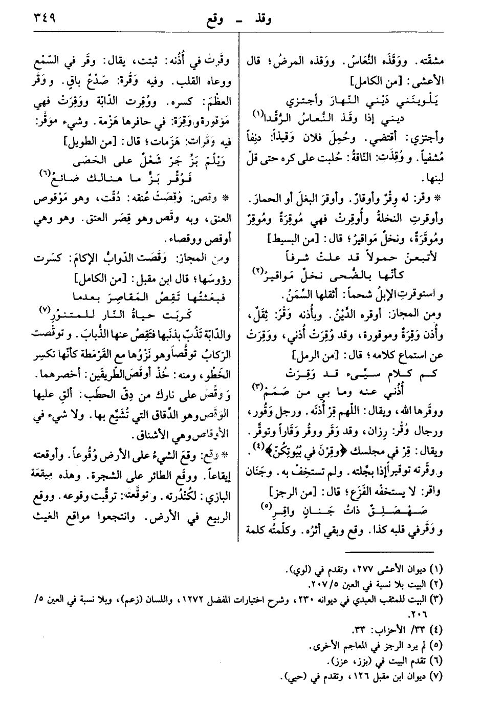 ووقرها الله، ويقال: اللهم قر أذنه. ورجل وقور، ورجال وقر: رزان، وقد وقر ووقر وقاراً وتوقّر. ويقال: قر في مجلسك " وقرن في بيوتكنّ ". ووقّرته توقيراً إذا بجلته، ولم تستخفّ به. وجنان واقر: لا ستخفّه الفزع. قال: