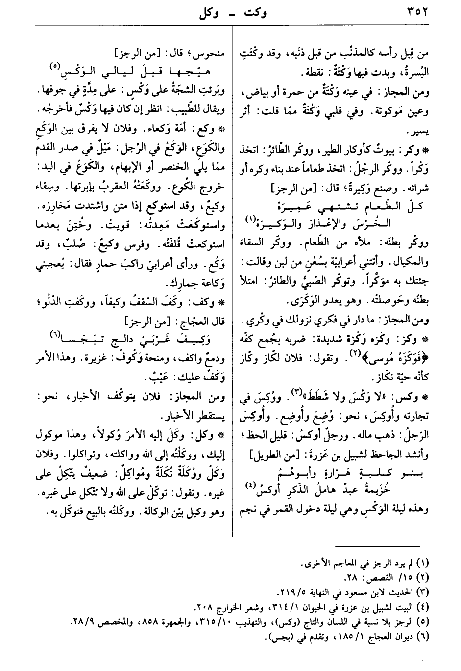 أمه وكعاء. وفلان لا يفرق بين الوكع والكوع، الوكع في الرّجل: ميل في صدر القدم ممايلي الخنصر أو الإبهام، والكوع في اليد: خروج الكوع. ووكعته العقرب بإبرتها. وسقاء وكيع، وقد استوكع إذا متن واشتدت مخارزه. واستوكعت معدته: قويت. وختن بعد ما استوكعت قلفته. وفرس وكيع: صلب، وقد وكع. ورأى أعرابيّ راكب حمارٍ فقال: يعجبني وكاعة حمارك.