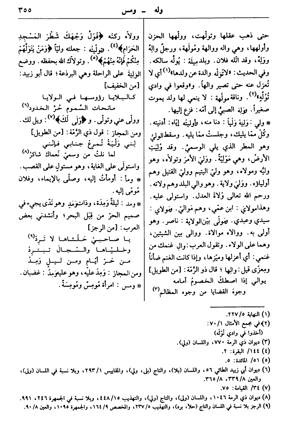 وليه ولياً: دنا منه، وأوليته إياه: أدنيته. وكل مما يليك، وجلست مما يليه. وسقط الويّ وهو المطر الذي يلي الوسميّ. وقد وليت الأرض، وهي موليّة. وولي الأمر وتولاّه، وهو وليه ومولاه، وهو وليّ اليتيم ووليّ القتيل وهم أولياؤه. ووليَ ولاية. وهو والي البلد وهم ولاته. ورحم الله تعالى ولاة العدل. واستولى عليه. وهذا مولاي: ابن عمي، وهم مواليّ. ومولاي: سيدي وعبدي. ومولًى بيّن الولاية: ناصر. وهو أولى به. ووالاه موالاة. ووالى بين الشيئين، وهما على الولاء. وتقول العرب: وال غنمك من غنمي أي اعزلها وميّزها، وإذا كانت الغنم ضأناً ومعزًى، قيل: والهاً. قال ذو الرمة: