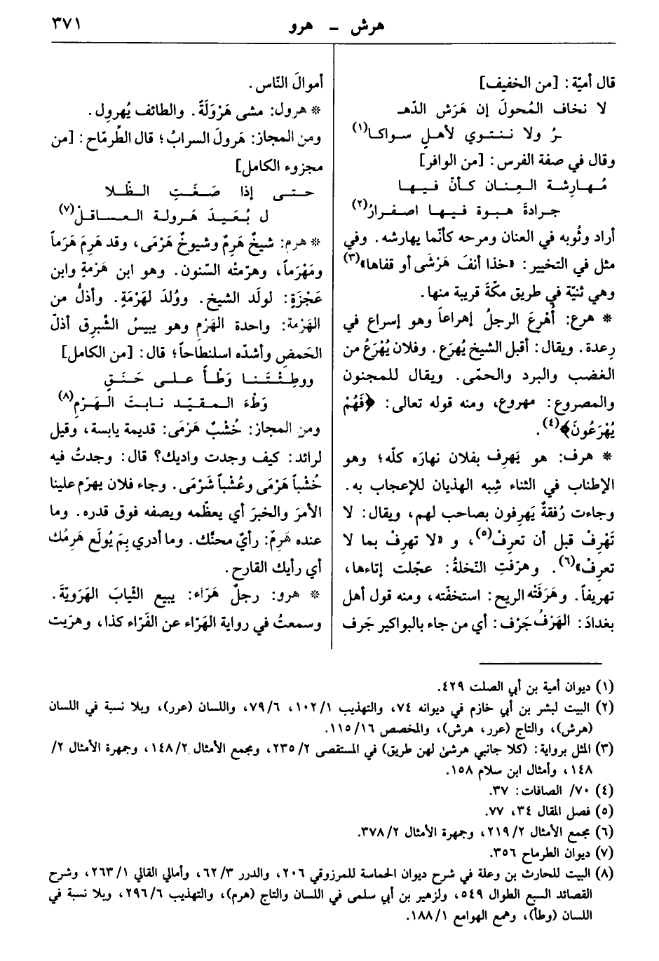 هو يهرف بفلان نهاره كلّه وهو الإطناب في النثاء شبه الهذيان للإعجاب به. وجاءت رفقة يهرفون بصاحب لهم، ويقال: لا تهرف، قبل أن تعرف، و" لا تهرف، بما لا تعر ". وهرّفت النخلة: عجّلت إتاءها تهريفاً. وهرفته الريح: استخفّته، ومنه قول أهل بغداد: الهرف جرف أي من جاء بالبواكير جرف أموال الناس.