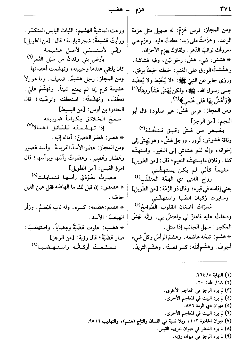 شجّة هاشمة. وهشم الرأس وكلّ شيء أجوف. وهشم أنفه: كسر قصبته. وهشم الثريد. ورعت الماشية الهشيم: النبات اليابس المتكسّر. ورأيت هشيمةً: شجرة يابسة. قال: