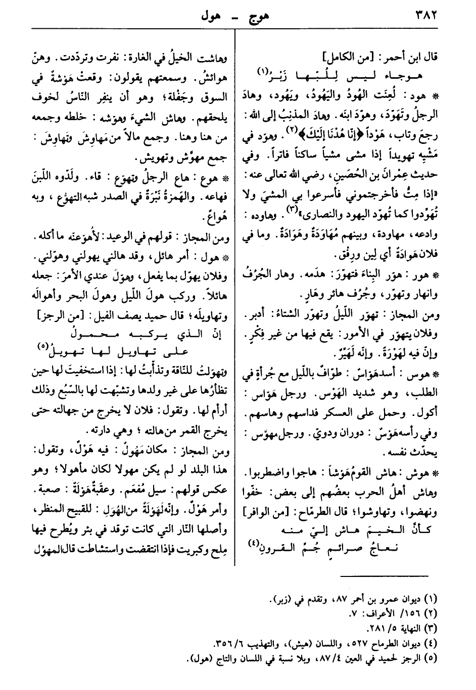 وهاشت الخيل في الغارة: نفرت وتردّدت. وهنّ هوائش. وسمعتهم يقولون: وقعت هوشةٌ في السوق وجفلة وهو أني نفر الناس لخوف يلحقهم. وهاش الشيء وهوّشه: خلطه وجمعه من هنا وهنا. وجمع مالاً من مهاوش وتهاوش: جمع مهوّش وتهويش.