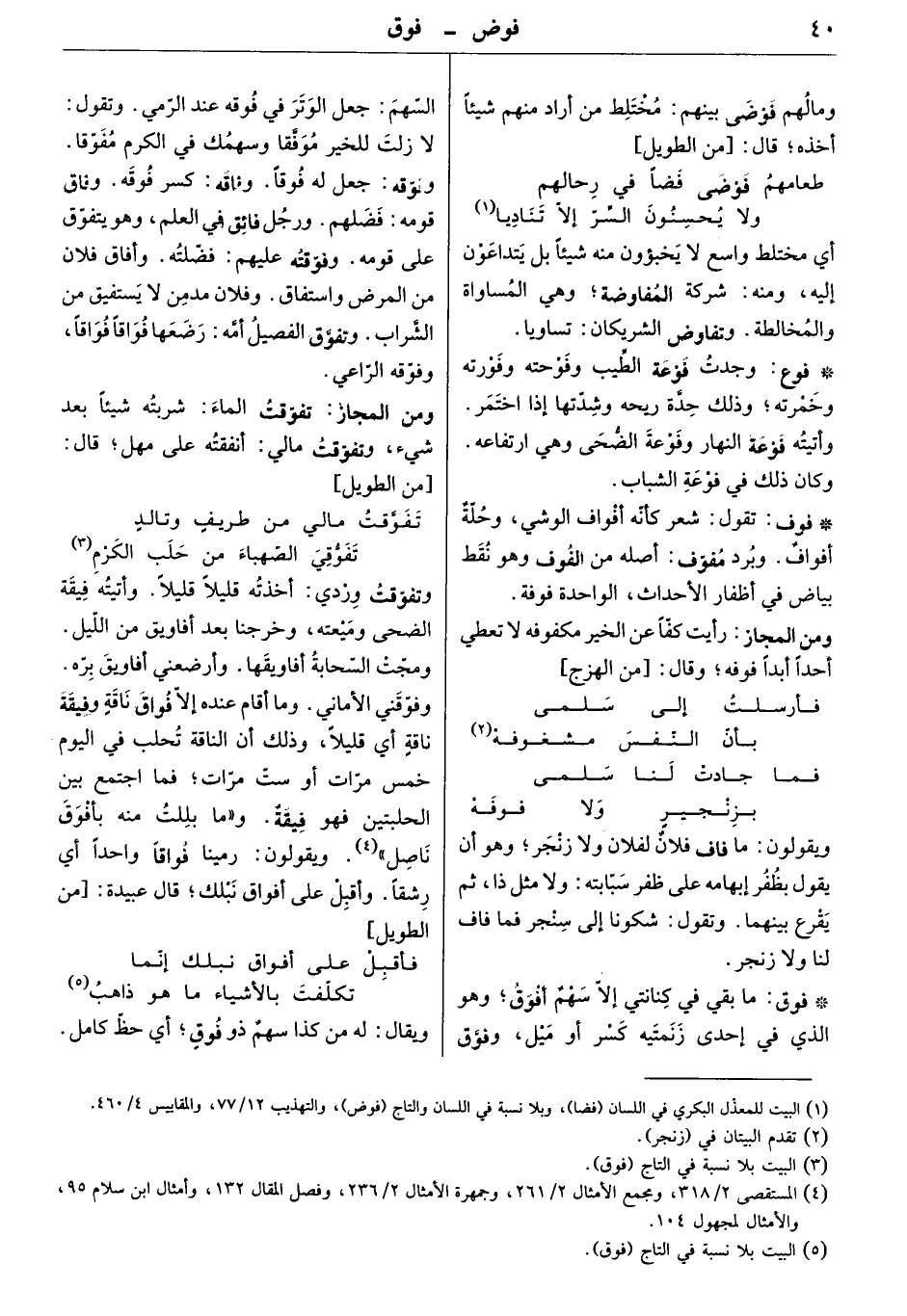 ما بقي في كنانتي إلا سهم أفوق وهو الذي في إحدى زنمتيه كسر أو ميل، وفوّق السهم: جعل الوتر في فوقه عند الرمي. وتقول: لازلت للخير موفّقاً، وسهمك في الكرم مفوّقاً. وفوّقه: جعل له فوقاً. وفاقه: كسر فوقه: وفاق قومه: فضلهم. ورجل فائق في العلم، وهو يتفوّق على قومه. وفوّقته عليهم: فضّلته. وأفاق فلان من المرض واستفاق. وفلان مدمن لا يستفيق من الشّراب. وتفوّق الفصيل أمّه: رضعها فواقاً فواقاً، وفوّقه الرّاعي.