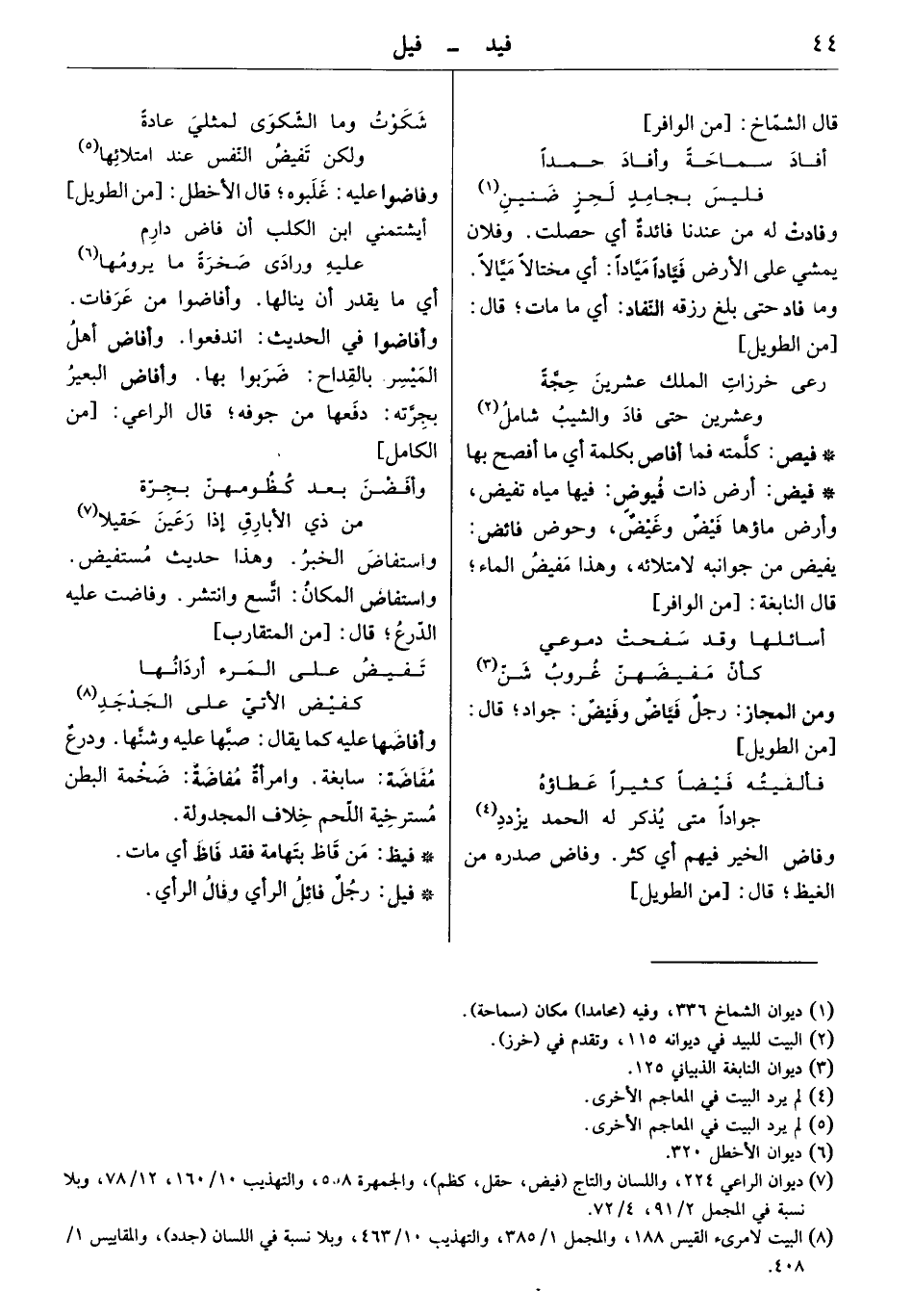 وفادت له من عندنا فائدة أي حصلت. وفلان يمشي على الأرض فيّاداً ميّاداً أي مختالاً ميّالاً. وما فاد، حتى بلغ رزقه النفاد؛ أي ما مات. قال: