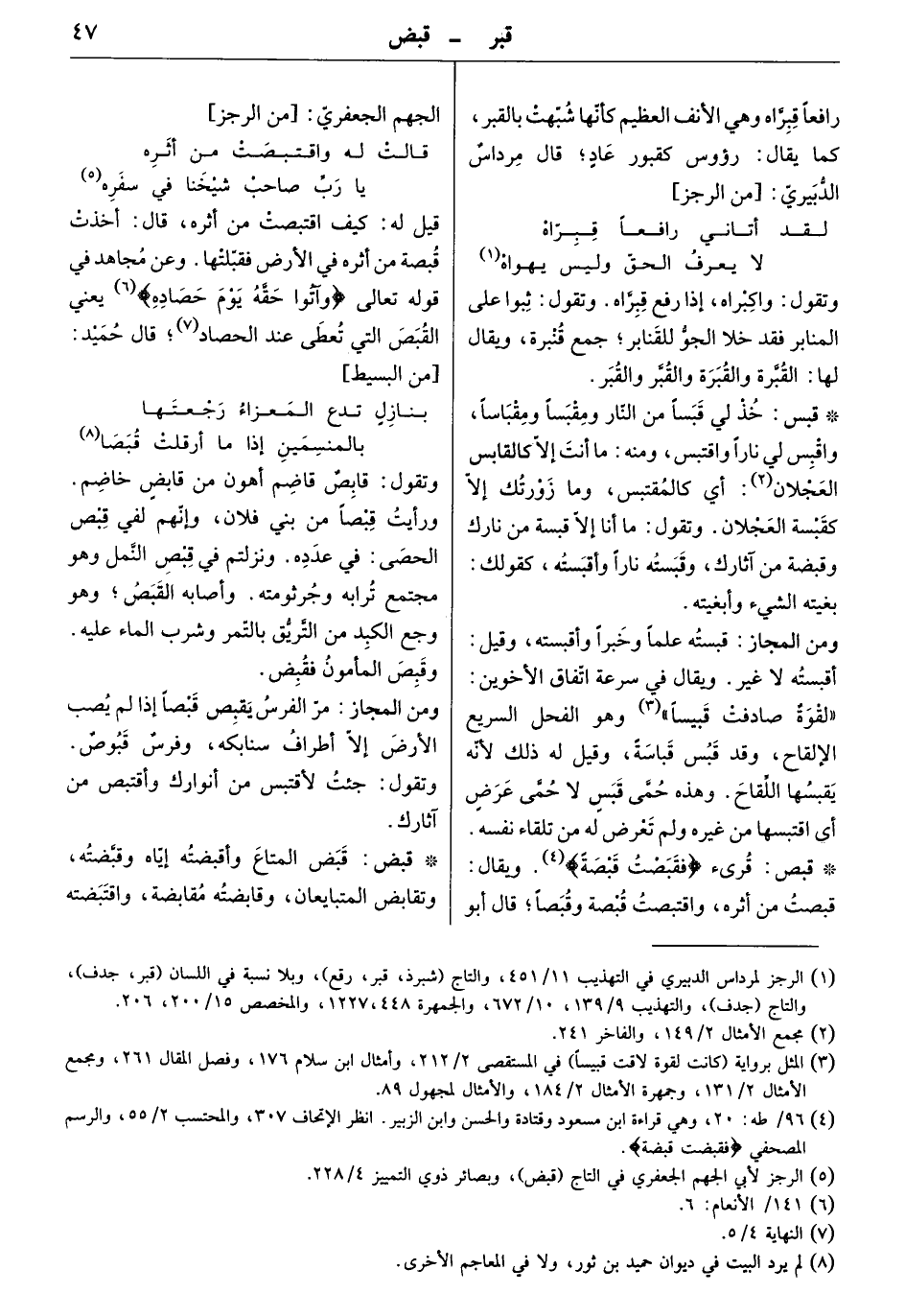 قيل له: كيف اقتبصت من أثره، قال: أخذت قبصة من أثره في الأرض فقبّلتها. وعن مجاهد في قوله تعالى: " وآتوا حقّه يوم حصاده " يعني القبص التي تعطى عند الحصاد. قال حميد: