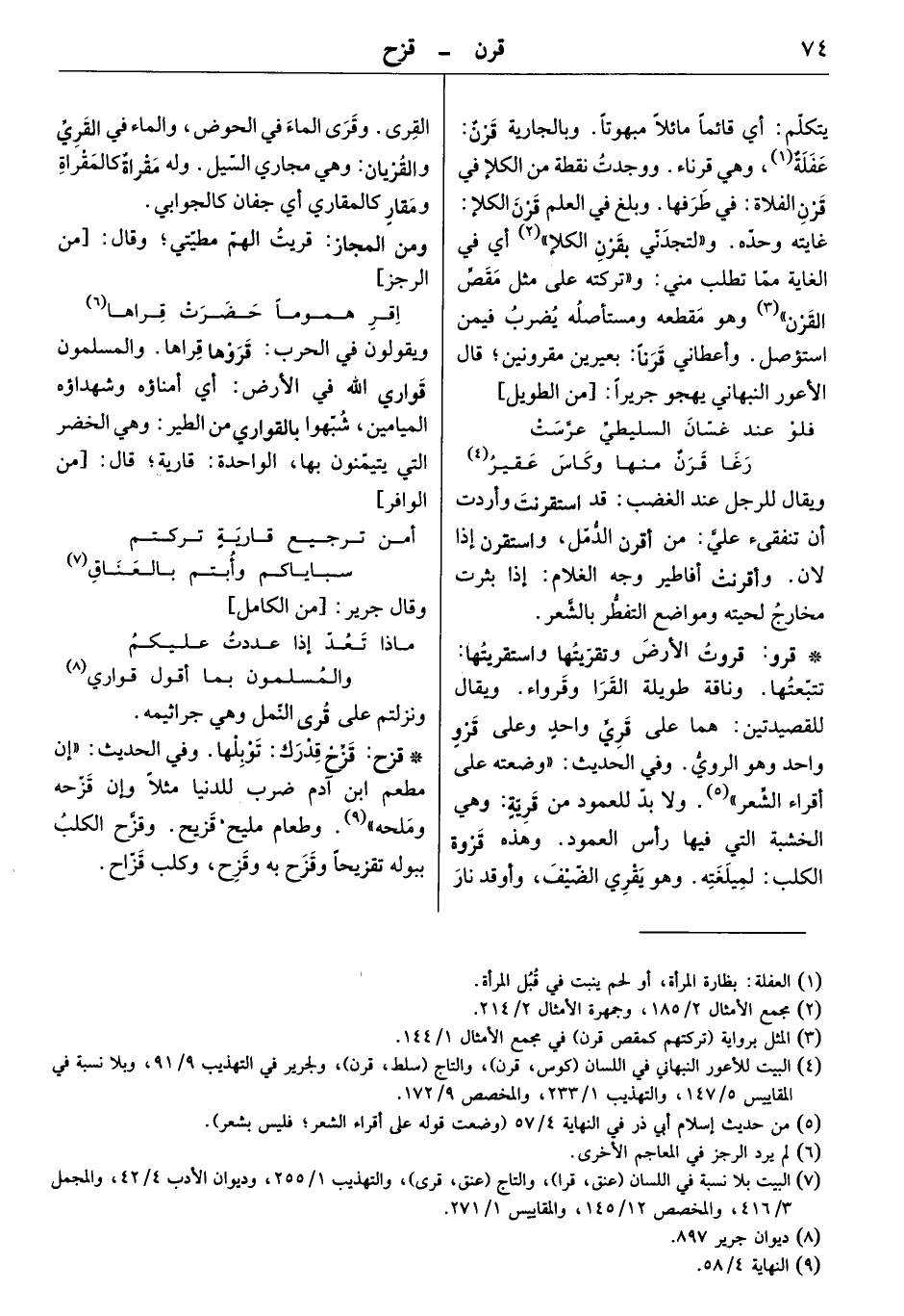 يتكلم أي قائماً مائلاً مبهوتاً. وبالجارية قرنٌ: عفلةٌ، وهي قرناء. ووجدت نقطة من الكلإ في قرن الفلاة: في طرفها. وبلغ في العلم قرن الكلإ: غايته وحدّه. ولتجدنّي بقرن الكلإ أي في الغاية مما تطلب منّي. " وتركته على مثل مقصّ القرن " وهو مقطعه ومستأصله يضرب فيمن استؤصل. وأعطاني قرناً: بعيرين مقرونين. قال الأعور النبهانيّ يهجو جريراً: