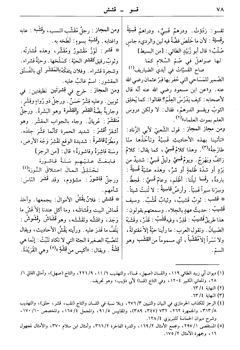 ومن مجاز المجاز: قول الشّعبيّ لأبي الزّناد: تأتينا بهذه الأحاديث قسيّةً وتأخذها منّا طازجةً وهذا كلام قسيٌّ، كما يقال: كلامٌ زائفٌ وبهرجٌ. ويوم قسيٌّ وليلٌ قسيّ: شديد من بردٍ أو شدّة ظلمةٍ أو شرّ، وهذه عشيةٌ قسيةٌ: باردة، وقسا ليلنا: أظلم، وعامٌ قسي: قحط. وسرنا سيراً قسياً. وأرض قاسية: لا تنبت شيئاً.