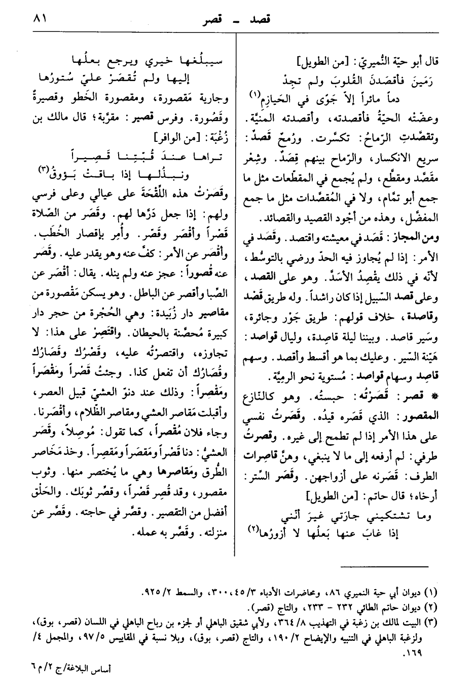 وعضته الحية فأقصدته، وأقصدته المنيّة. وتقصّدت الرماح: تكسّرت. ورمح قصدٌ: سريع الانكسار، والرماح بينهم قصد. وشعر مقصّد ومقطع، ولم يجمع في المقطعات مثل ما جمع أبو تمام ولا في المقصّدات مثل ما جمع المفضّل، وهذه من أجود القصيد والقصائد.