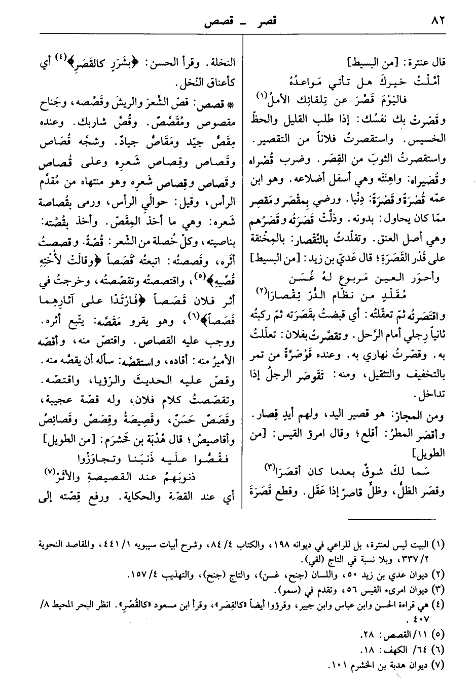 قصّ الشّعر والريش وقصّصه، وجناح مقصوص ومقصّصٌ. وقصّ شاربك. وعنده مقص جيد ومقاص جياد. وشجّه قصاص شعره وعلى قصاص شعره وهو منتهاه من مقدّم الرأس، وقيل: حوالي الرأس، ورمى بقصاصة شعره وهي ما أخذ المقصّ. وأخذ بقصّته: بناصيته، وكلّ خصلة من الشعر: قصةٌ. وقصصت أثره، وقصصته: اتبعته قصصاً " وقالت لأخته قصّيه " واقتصصته وتقصّصته، وخرجت في أثر فلان قصصاً " فارتدا على آثارهما قصصاً " وهو يقرو مقصّه: يتّبع اثره. ووجب عليه القصاص. واقتصّ منه، وأقصّه الأمير منه: أقاده، واستقصّه: سأله أن يقصّه منه. وقصّ عليه الحديث والرؤيا، واقتصّه. وتقصّصت كلام فلان، وله قصّة عجيبة، وقصص حسن، وقصيصة وقصص وقصائص وأقاصيص. قال هدبة بن خشرم: