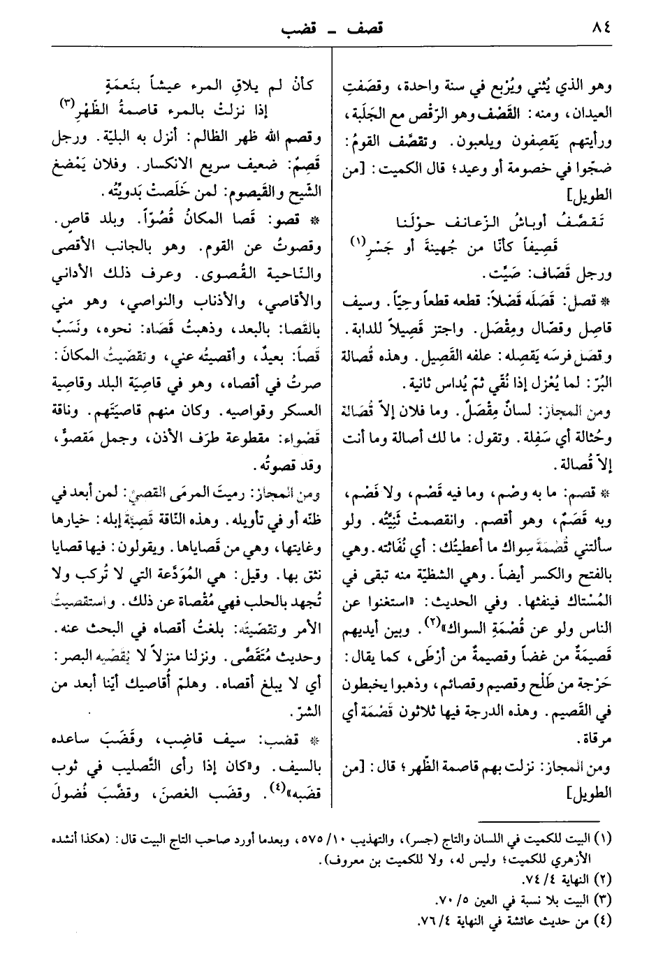 ما به وصم، وما فيه قصم، ولا فصم، وبه قصم، وهو أقصم. وانقصمت ثنيّته. ولو سألتني قصمة سواك ما أعطيتك أي نفاثته وهي الشظيّة منه تبقى في المستاك فينفثها. وفي الحديث " استغنوا عن الناس ولو عن قصمة السواك " وبين أيديهم قصيمةٌ من غضاً وقصيمةٌ من أرطى، كما يقال: حرجة من طلح وقصيم وقصائم، وذهبوا يخبطون في القصيم. وهذه الدرجة فيها ثلاثون قصمة أي مرقاة.
