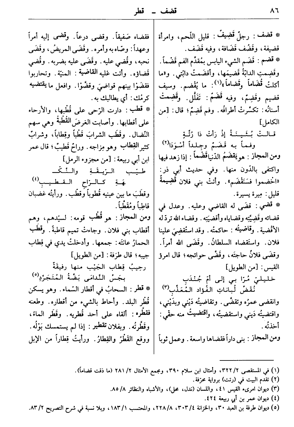 ومن المجاز: بنى داراً فقضاها واسعة. وعمل ثوباً فقضاه صفيقاً. وقضى درعاً. وقضى إليه أمراً وعهداً: وصّاه به وأمره. وقضى المريض، وقضى نحبه، وقضي عليه. وقضى عليه بضربه. وقضي قضاؤه. وأتت عليه القاضية: المنيّة. وحاربوا فقضوا بينهم قواضي وقضّوا. وافعل ما يقتضيه كرمك أي يطالبك به.