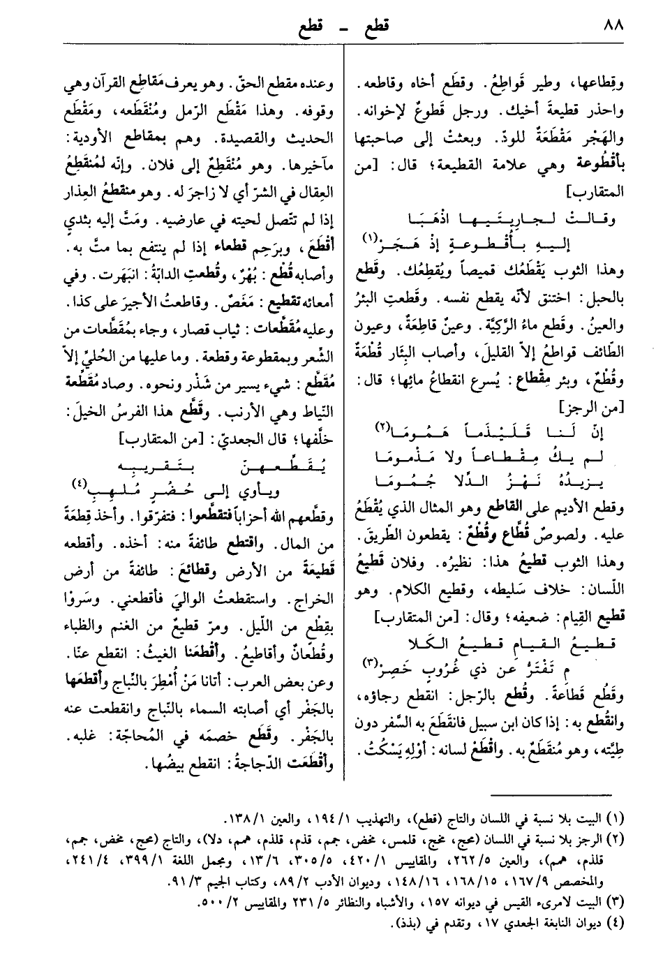 وقطع قطاعةً. وقطع بالرجل: انقطع رجاؤه، وانقطع به إذا كان ابن سبيل فانقطع به السفر دون طيّته، وهو منقطع به. اقطع لسانه: أوله يسكت. وعنده مقطع الحقّ. وهو يعرف مقاطع القرآن وهي وقوفه. وهذا مقطع الرمل ومنقطعه، ومقطع الحديث والقصيدة. وهم بمقاطع الأودية: مآخيرها. وهو منقطعٌ إلى فلان. وإنه لمنقطع العقال في الشرّ أي لا زاجر له. وهو منقطع العذار إذا لم تتصل لحيته في عارضيه. ومتّ إليه بثديٍ أقطع، وبرحم قطعاء إذا لم ينتفع بما متّ به. وأصابه قطع: بهرٌ، وقطعت الدابة: انبهرت. وفي أمعائه تقطيع: مغصٌ. وقاطعت الأجير على كذا. وعليه مقطّعات: ثياب قصار، وجاء بمقطّعات من الشعر وبمقطوعة وقطعة. وما عليها من الحليّ إلا مقطّع: شيء يسير من شذر ونحوه. وصاد مقطّعة النّياط وهي الأرنب. وقطّع هذا الفرس الخيل: خلّفها. قال الجعديّ: