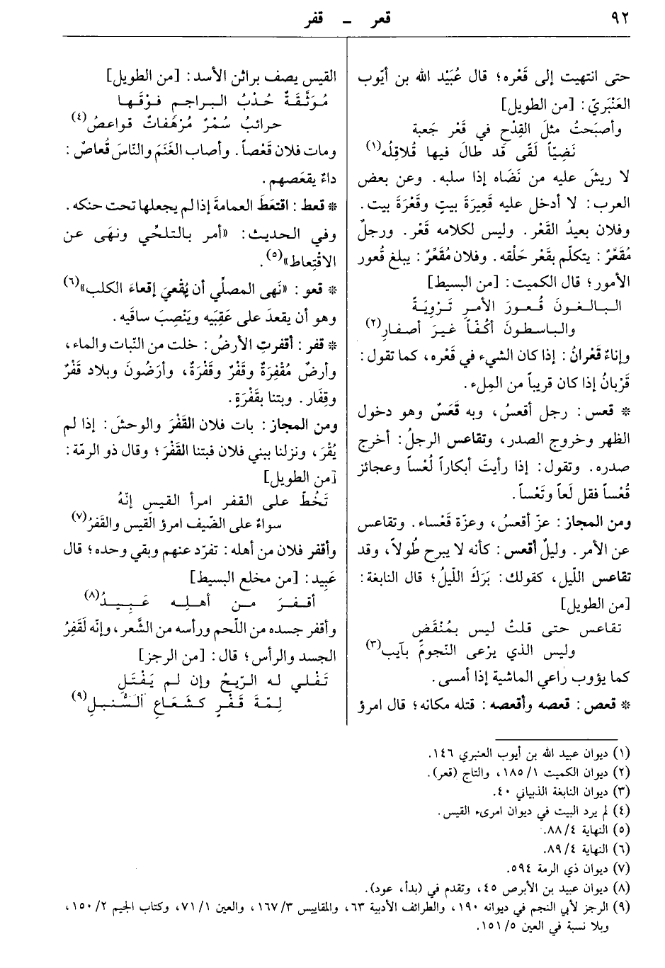 لا ريش عليه من نضاه إذا سلبه. وعن بعض العرب: لا أدخل عليه قعيرة بيتٍ وقعرة بيت. وفلان بعيد القعر. وليس لكلامه قعر. ورجل مقعر: يتكلم بقعر حلقه. وفلان مقعّرٌ: يبلغ قعور الأمور. قال الكميت: