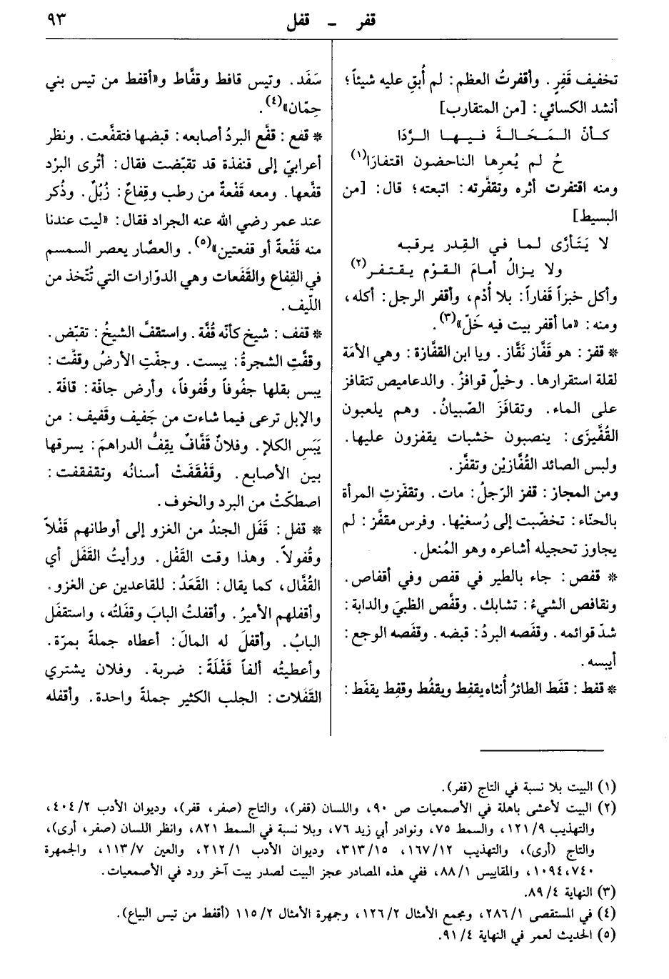 قفّع البرد أصابعه: قبضها فتقفّعت. ونظر أعرابيّ إلى قنفذة قد تقبّضت فقال: أترى البرد قفّعها. ومعه قفعةٌ من رطب وقفاعٌ: زبلٌ. وذكر عند عمر رضي الله عنه الجراد فقال: ليت عندنا منه قفعةً أو قفعتين. والعصذار يعصر السمسم في القفاع والقفعات وهي الدوّارات التي تتّخذ من الليف.