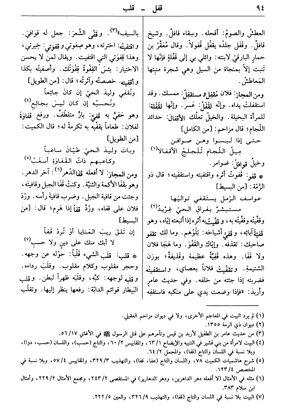 ومن المجاز: لا أفعله قفا الدهر: آخر الدهر. وهو بقفا الأكمة والثنيّة. وكنت قفا الجبل وقافيته، وجئت من قافية الجبل. وضرب قافية رأسه. وردّ فلان على قفاه، وردّ قفاً إذا هرم. قال: