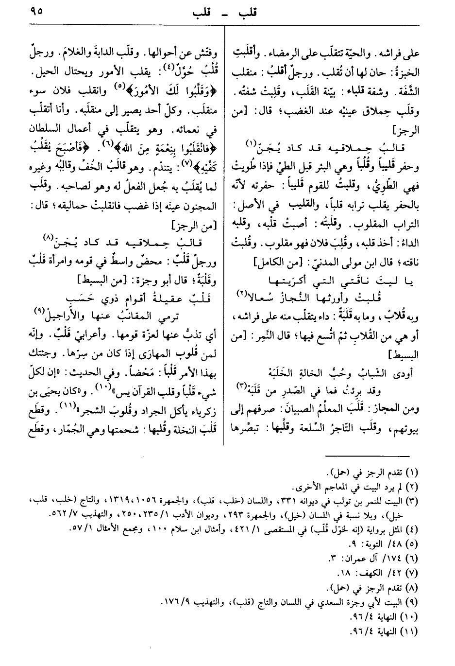 أي تذبّ عنها لعزة قومها. وأعرابي قلب. وإنه لمن قلوب المهاري إذا كان من سرّها. وجئتك بهذا الأمر قلباً: محضاً. وفي الحديث " إن لكل شيء قلباً وقلب القرآن يس ". وكان يحيى ابن زكرياء يأكل الجراد وقلوب الشجر. وقطع قلب النخلة وقلبها: شحمتها وهي الجمّار، وقطع