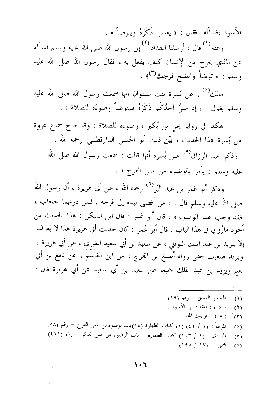 (¬4) الموطأ: (1/ 42) (2) كتاب الطهارة (15) باب الوضوء من مس الفرج - رقم (58).